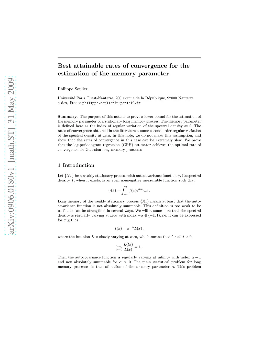 The purpose of this note is to prove a lower bound for the estimation of the memory parameter of a stationary long memory process. The memory parameter is defined here as the index of regular variation of the spectral density at 0. The rates of convergence obtained in the literature assume second order regular variation of the spectral density at zero. In this note, we do not make this assumption, and show that the rates of convergence in this case can be extremely slow. We prove that the log-periodogram regression (GPH) estimator achieves the optimal rate of convergence for Gaussian long memory processes.