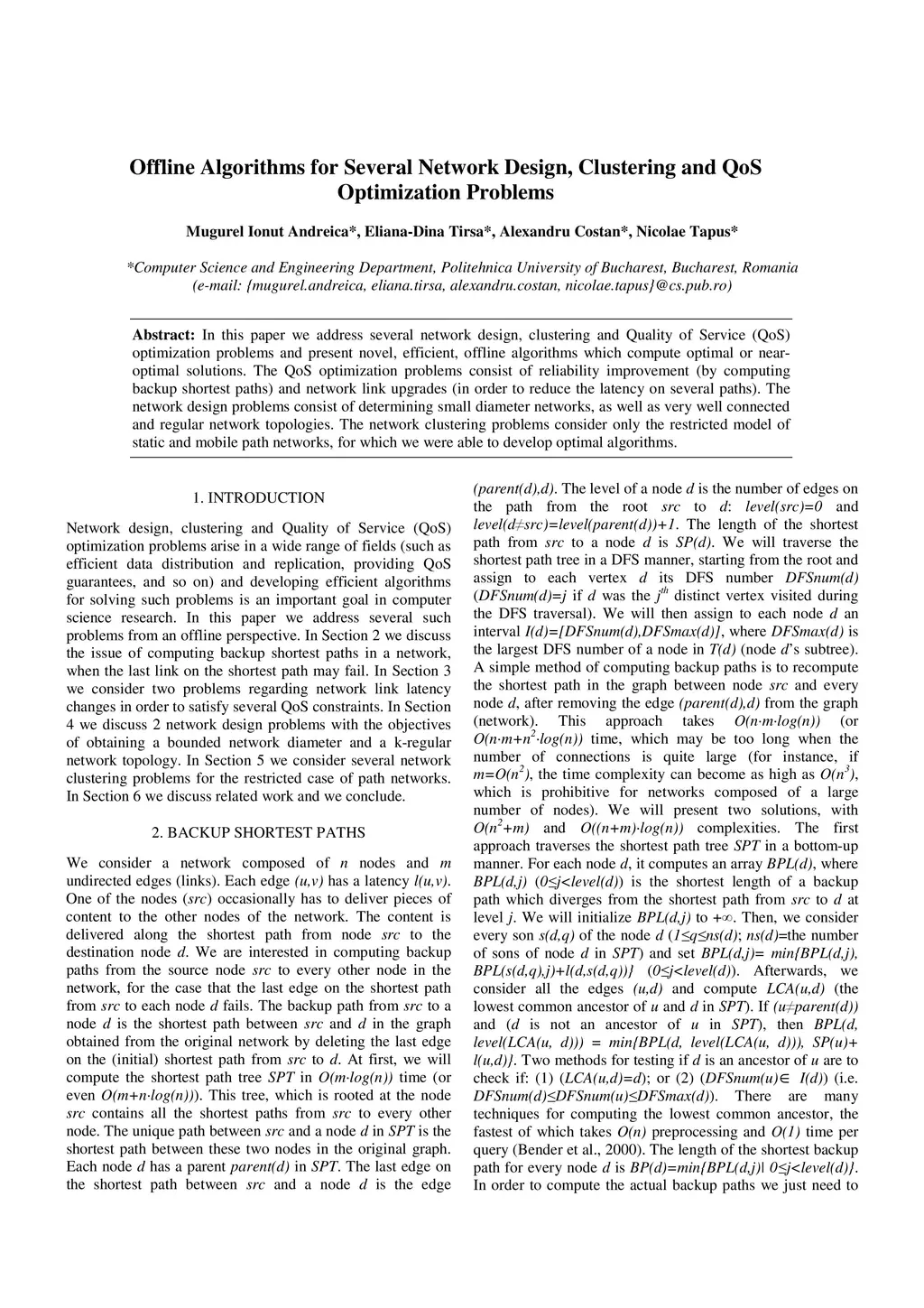 In this paper we address several network design, clustering and Quality of Service (QoS) optimization problems and present novel, efficient, offline algorithms which compute optimal or near-optimal solutions. The QoS optimization problems consist of reliability improvement (by computing backup shortest paths) and network link upgrades (in order to reduce the latency on several paths). The network design problems consist of determining small diameter networks, as well as very well connected and regular network topologies. The network clustering problems consider only the restricted model of static and mobile path networks, for which we were able to develop optimal algorithms.
