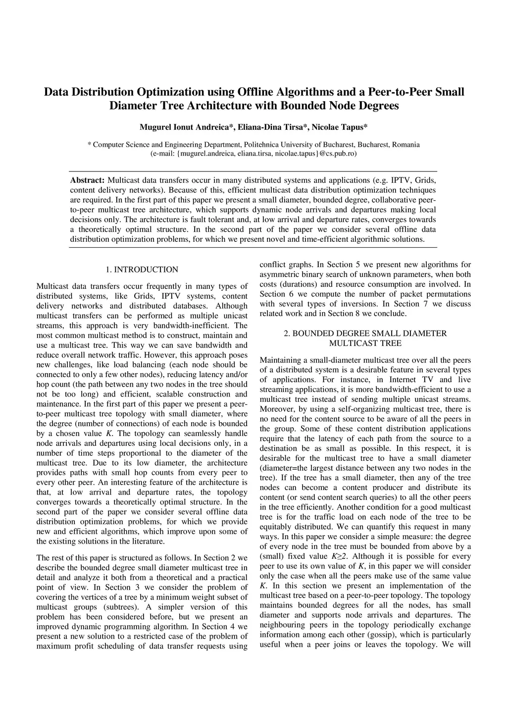 Multicast data transfers occur in many distributed systems and applications (e.g. IPTV, Grids, content delivery networks). Because of this, efficient multicast data distribution optimization techniques are required. In the first part of this paper we present a small diameter, bounded degree, collaborative peer-to-peer multicast tree architecture, which supports dynamic node arrivals and departures making local decisions only. The architecture is fault tolerant and, at low arrival and departure rates, converges towards a theoretically optimal structure. In the second part of the paper we consider several offline data distribution optimization problems, for which we present novel and time-efficient algorithmic solutions.