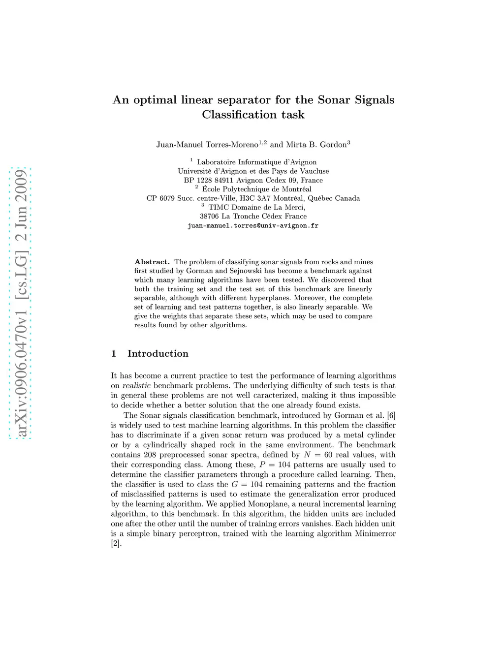 The problem of classifying sonar signals from rocks and mines first studied by Gorman and Sejnowski has become a benchmark against which many learning algorithms have been tested. We show that both the training set and the test set of this benchmark are linearly separable, although with different hyperplanes. Moreover, the complete set of learning and test patterns together, is also linearly separable. We give the weights that separate these sets, which may be used to compare results found by other algorithms.