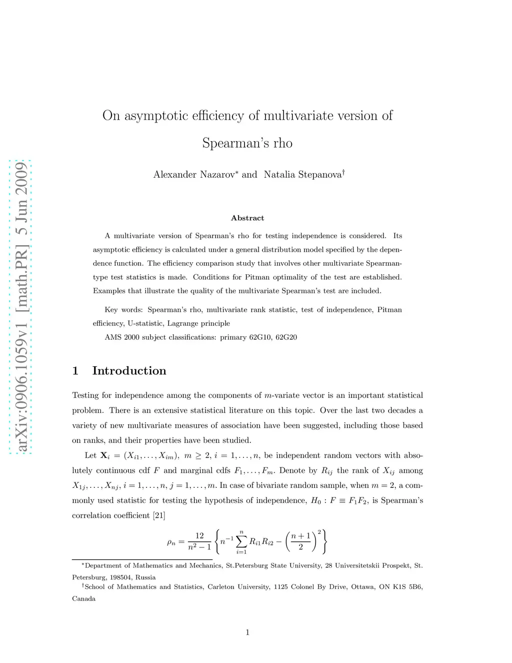 On asymptotic efficiency of multivariate version of Spearman's rho