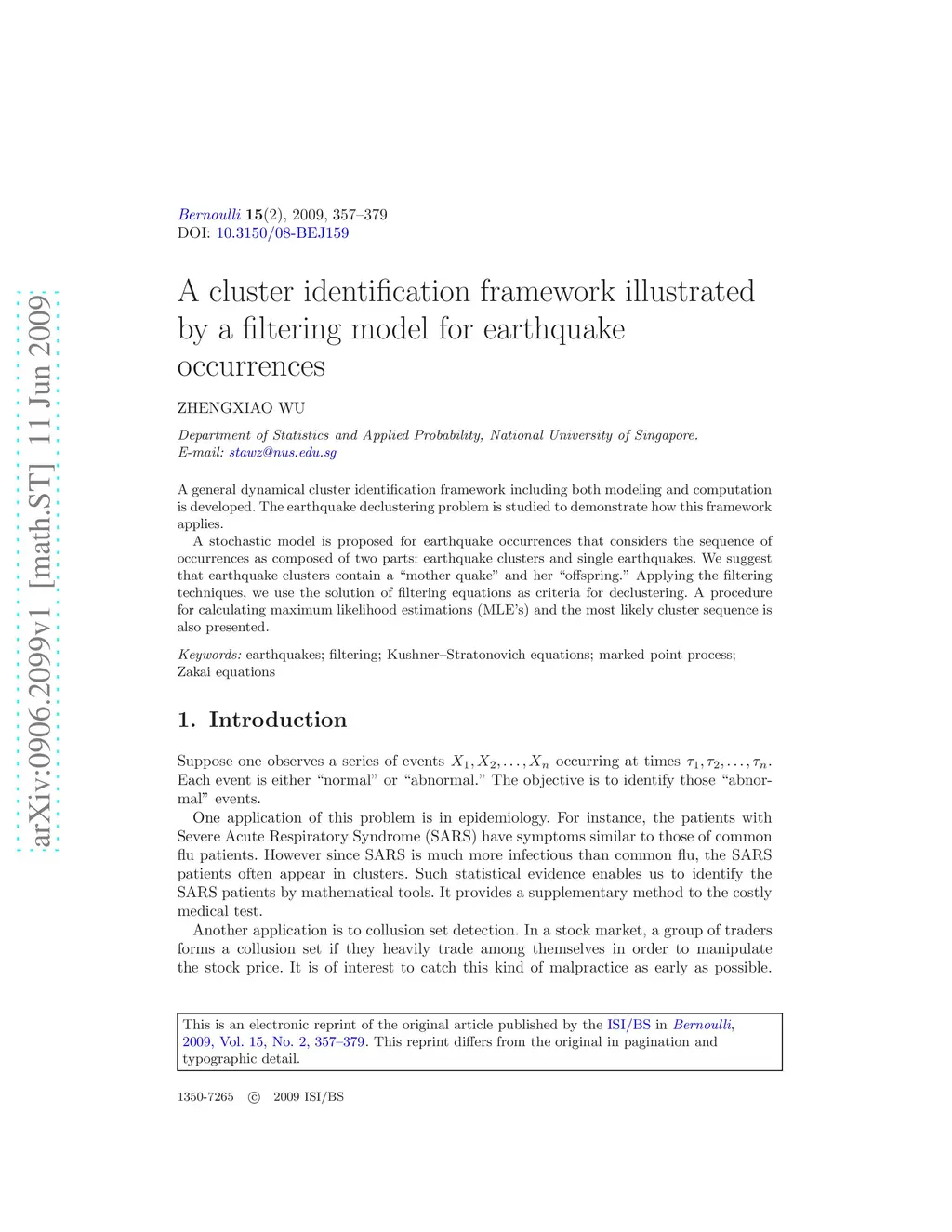 A general dynamical cluster identification framework including both modeling and computation is developed. The earthquake declustering problem is studied to demonstrate how this framework applies. A stochastic model is proposed for earthquake occurrences that considers the sequence of occurrences as composed of two parts: earthquake clusters and single earthquakes. We suggest that earthquake clusters contain a ``mother quake'' and her ``offspring.'' Applying the filtering techniques, we use the solution of filtering equations as criteria for declustering. A procedure for calculating maximum likelihood estimations (MLE's) and the most likely cluster sequence is also presented.