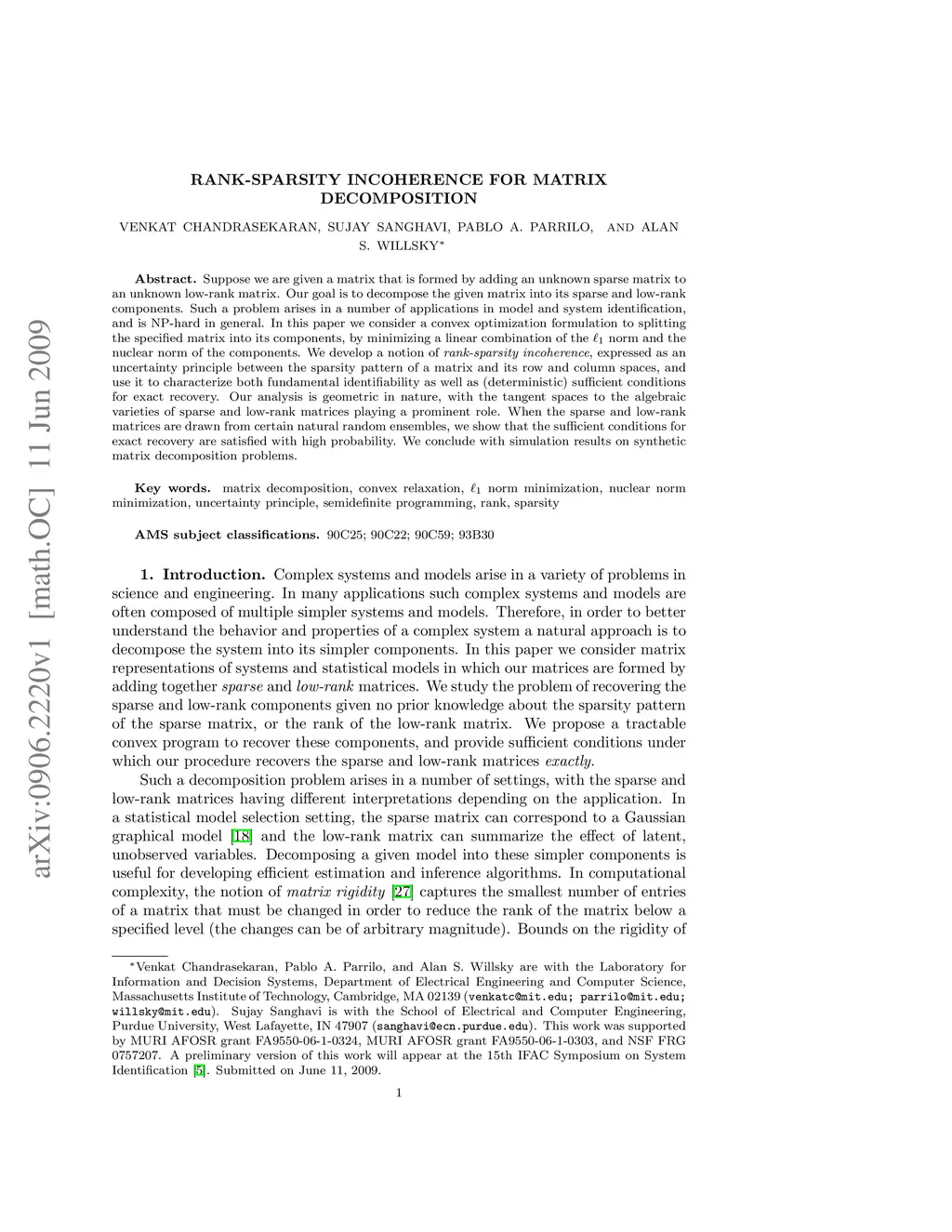 Suppose we are given a matrix that is formed by adding an unknown sparse matrix to an unknown low-rank matrix. Our goal is to decompose the given matrix into its sparse and low-rank components. Such a problem arises in a number of applications in model and system identification, and is NP-hard in general. In this paper we consider a convex optimization formulation to splitting the specified matrix into its components, by minimizing a linear combination of the norm and the nuclear norm of the components. We develop a notion of \emph{rank-sparsity incoherence}, expressed as an uncertainty principle between the sparsity pattern of a matrix and its row and column spaces, and use it to characterize both fundamental identifiability as well as (deterministic) sufficient conditions for exact recovery. Our analysis is geometric in nature, with the tangent spaces to the algebraic varieties of sparse and low-rank matrices playing a prominent role. When the sparse and low-rank matrices are drawn from certain natural random ensembles, we show that the sufficient conditions for exact recovery are satisfied with high probability. We conclude with simulation results on synthetic matrix decomposition problems.