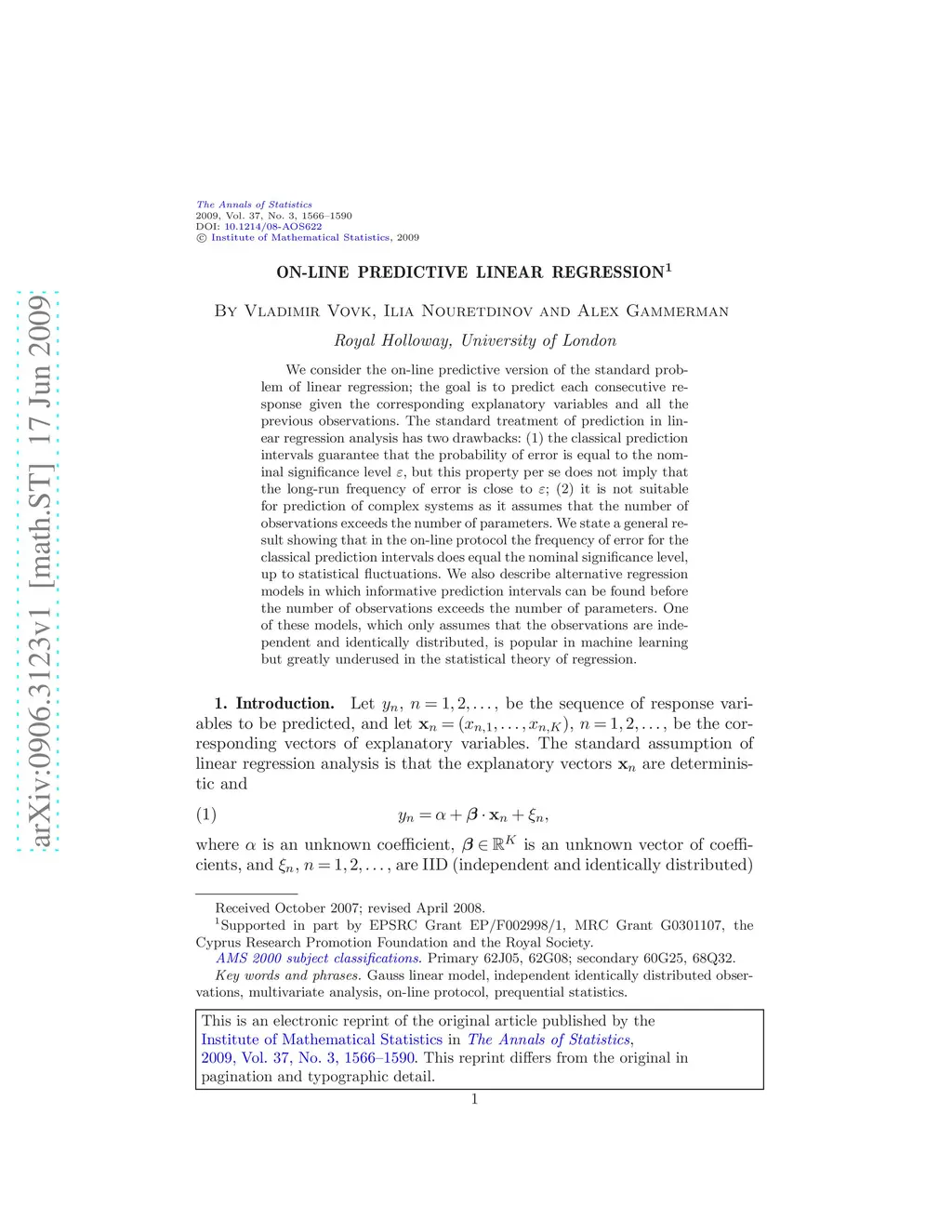 We consider the on-line predictive version of the standard problem of linear regression; the goal is to predict each consecutive response given the corresponding explanatory variables and all the previous observations. The standard treatment of prediction in linear regression analysis has two drawbacks: (1) the classical prediction intervals guarantee that the probability of error is equal to the nominal significance level , but this property per se does not imply that the long-run frequency of error is close to ; (2) it is not suitable for prediction of complex systems as it assumes that the number of observations exceeds the number of parameters. We state a general result showing that in the on-line protocol the frequency of error for the classical prediction intervals does equal the nominal significance level, up to statistical fluctuations. We also describe alternative regression models in which informative prediction intervals can be found before the number of observations exceeds the number of parameters. One of these models, which only assumes that the observations are independent and identically distributed, is popular in machine learning but greatly underused in the statistical theory of regression.