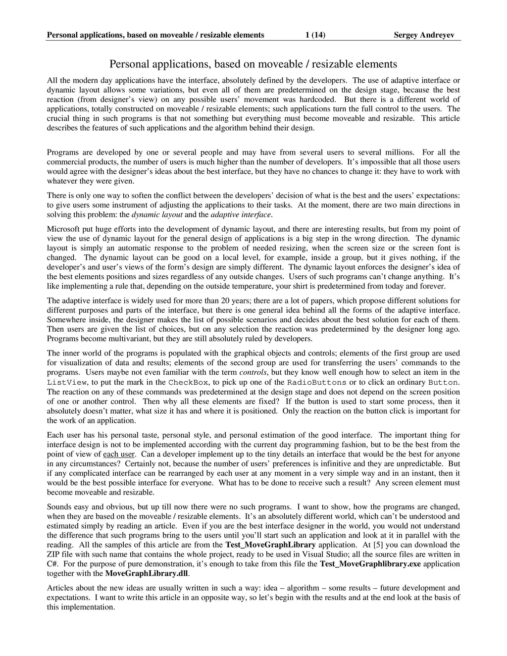 All the modern day applications have the interface, absolutely defined by the developers. The use of adaptive interface or dynamic layout allows some variations, but even all of them are predetermined on the design stage, because the best reaction (from designer's view) on any possible users' movement was hardcoded. But there is a different world of applications, totally constructed on moveable / resizable elements; such applications turn the full control to the users. The crucial thing in such programs is that not something but everything must become moveable and resizable. This article describes the features of such applications and the algorithm behind their design.