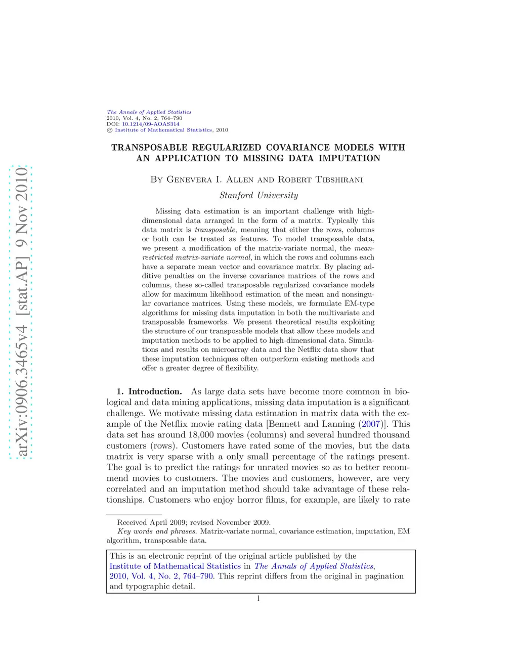 Missing data estimation is an important challenge with high-dimensional data arranged in the form of a matrix. Typically this data matrix is transposable, meaning that either the rows, columns or both can be treated as features. To model transposable data, we present a modification of the matrix-variate normal, the mean-restricted matrix-variate normal, in which the rows and columns each have a separate mean vector and covariance matrix. By placing additive penalties on the inverse covariance matrices of the rows and columns, these so-called transposable regularized covariance models allow for maximum likelihood estimation of the mean and nonsingular covariance matrices. Using these models, we formulate EM-type algorithms for missing data imputation in both the multivariate and transposable frameworks. We present theoretical results exploiting the structure of our transposable models that allow these models and imputation methods to be applied to high-dimensional data. Simulations and results on microarray data and the Netflix data show that these imputation techniques often outperform existing methods and offer a greater degree of flexibility.