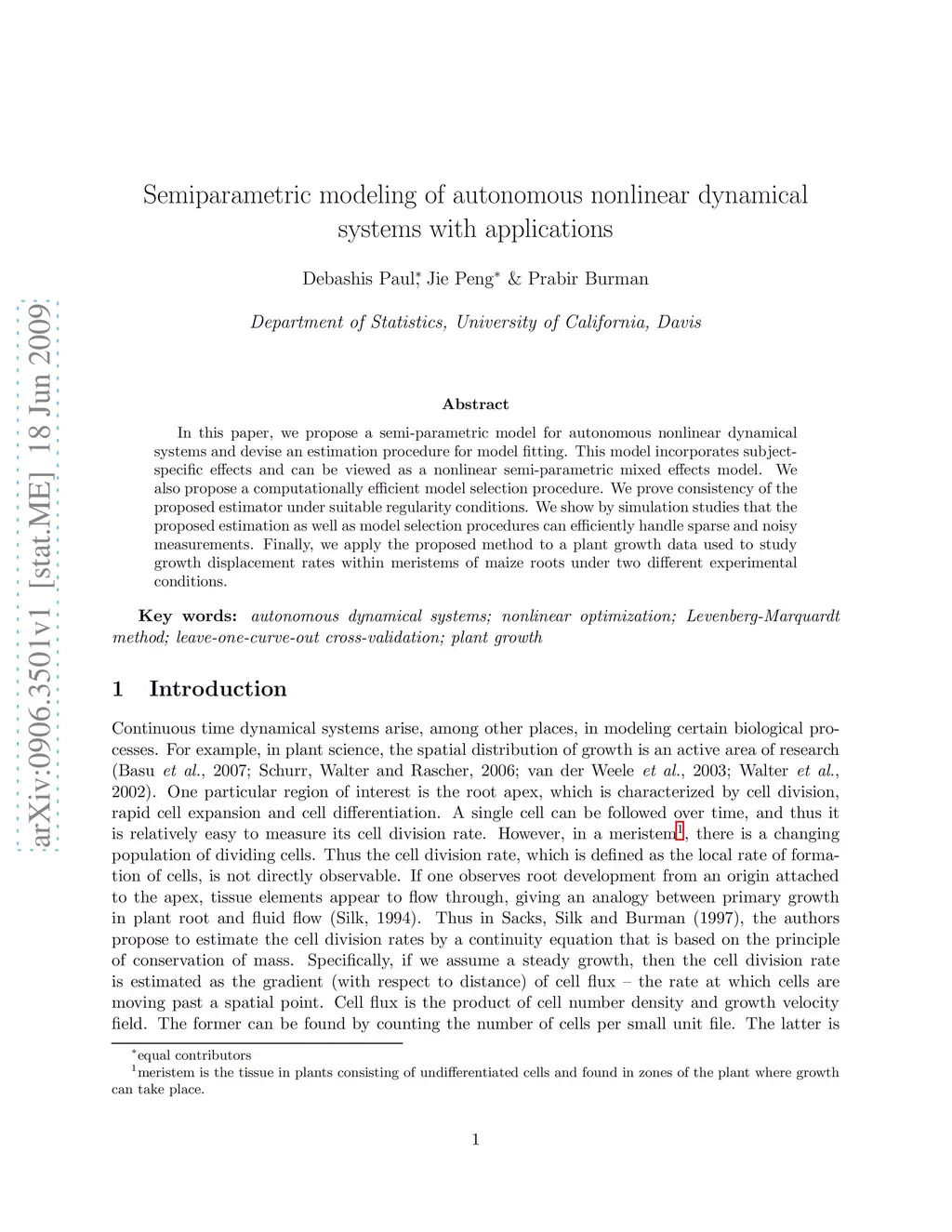 In this paper, we propose a semi-parametric model for autonomous nonlinear dynamical systems and devise an estimation procedure for model fitting. This model incorporates subject-specific effects and can be viewed as a nonlinear semi-parametric mixed effects model. We also propose a computationally efficient model selection procedure. We prove consistency of the proposed estimator under suitable regularity conditions. We show by simulation studies that the proposed estimation as well as model selection procedures can efficiently handle sparse and noisy measurements. Finally, we apply the proposed method to a plant growth data used to study growth displacement rates within meristems of maize roots under two different experimental conditions.