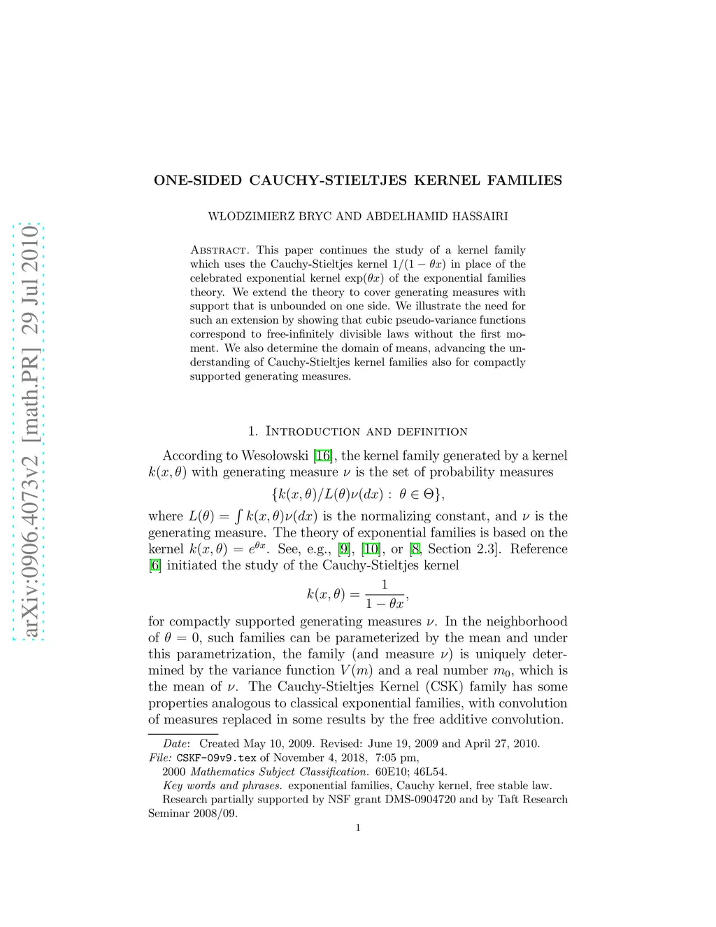 One-sided Cauchy-Stieltjes Kernel Families