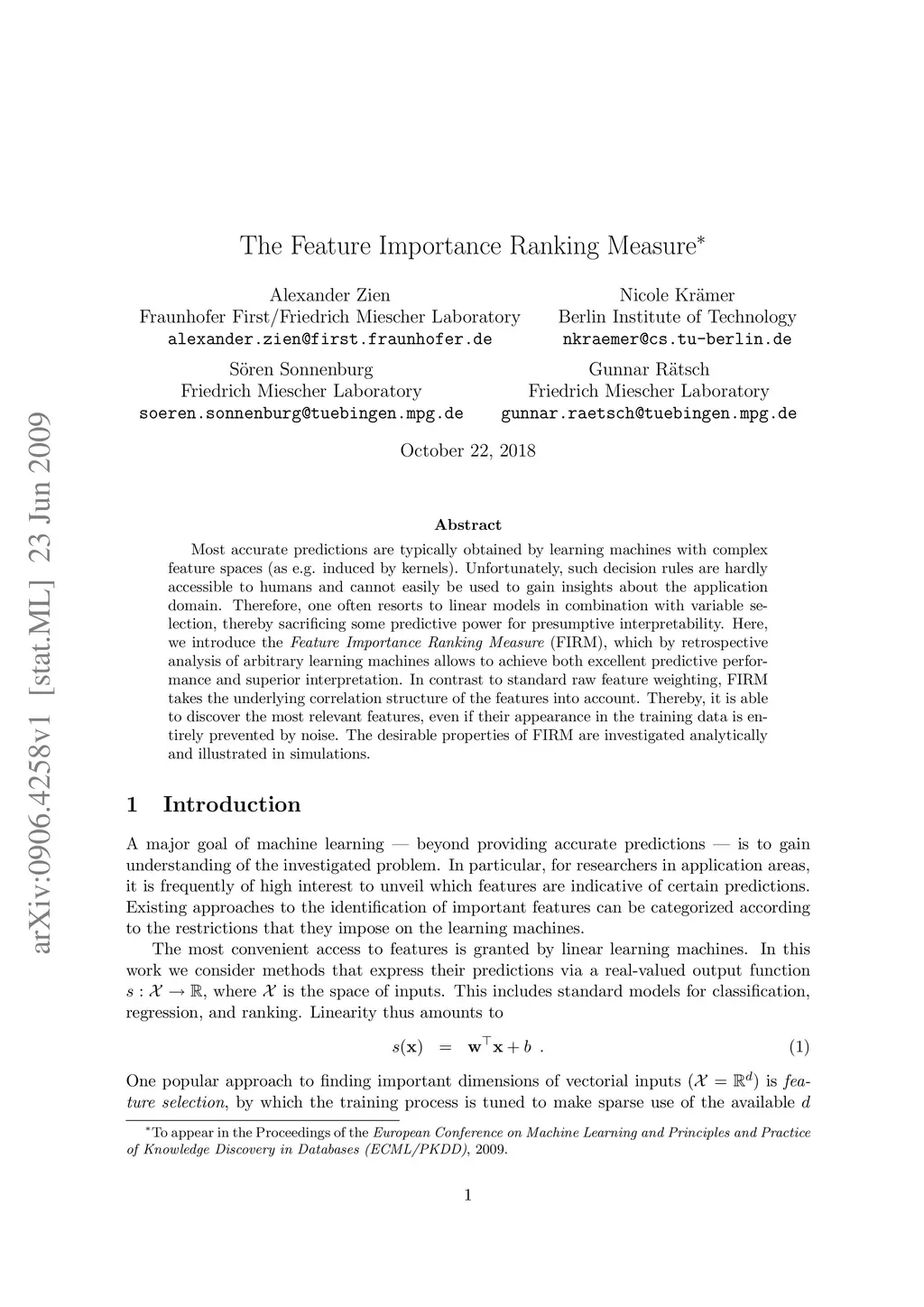Most accurate predictions are typically obtained by learning machines with complex feature spaces (as e.g. induced by kernels). Unfortunately, such decision rules are hardly accessible to humans and cannot easily be used to gain insights about the application domain. Therefore, one often resorts to linear models in combination with variable selection, thereby sacrificing some predictive power for presumptive interpretability. Here, we introduce the Feature Importance Ranking Measure (FIRM), which by retrospective analysis of arbitrary learning machines allows to achieve both excellent predictive performance and superior interpretation. In contrast to standard raw feature weighting, FIRM takes the underlying correlation structure of the features into account. Thereby, it is able to discover the most relevant features, even if their appearance in the training data is entirely prevented by noise. The desirable properties of FIRM are investigated analytically and illustrated in simulations.