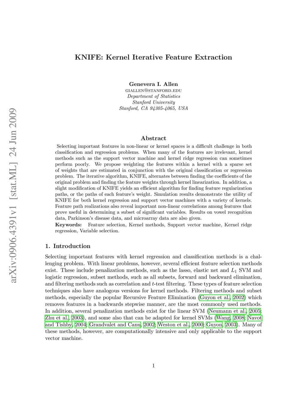 Selecting important features in non-linear or kernel spaces is a difficult challenge in both classification and regression problems. When many of the features are irrelevant, kernel methods such as the support vector machine and kernel ridge regression can sometimes perform poorly. We propose weighting the features within a kernel with a sparse set of weights that are estimated in conjunction with the original classification or regression problem. The iterative algorithm, KNIFE, alternates between finding the coefficients of the original problem and finding the feature weights through kernel linearization. In addition, a slight modification of KNIFE yields an efficient algorithm for finding feature regularization paths, or the paths of each feature's weight. Simulation results demonstrate the utility of KNIFE for both kernel regression and support vector machines with a variety of kernels. Feature path realizations also reveal important non-linear correlations among features that prove useful in determining a subset of significant variables. Results on vowel recognition data, Parkinson's disease data, and microarray data are also given.