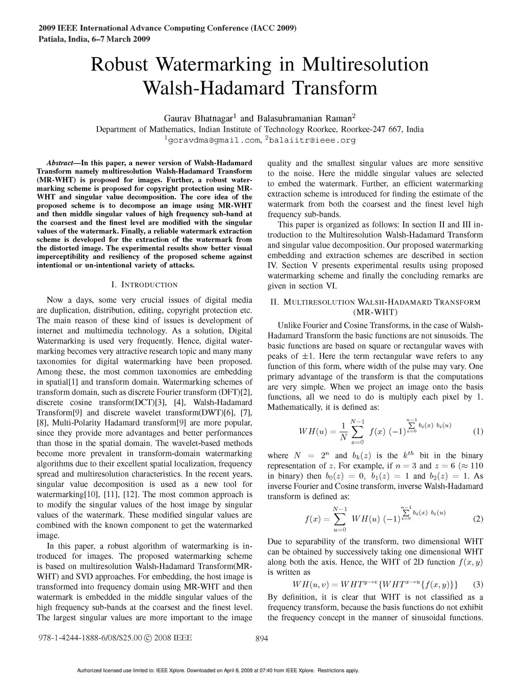 Robust Watermarking in Multiresolution Walsh-Hadamard Transform