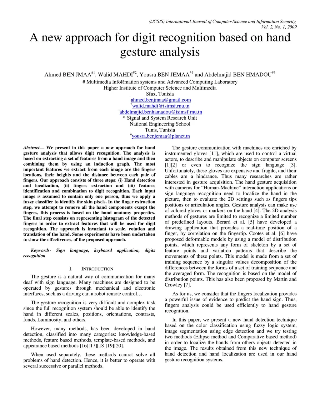 We present in this paper a new approach for hand gesture analysis that allows digit recognition. The analysis is based on extracting a set of features from a hand image and then combining them by using an induction graph. The most important features we extract from each image are the fingers locations, their heights and the distance between each pair of fingers. Our approach consists of three steps: (i) Hand detection and localization, (ii) fingers extraction and (iii) features identification and combination to digit recognition. Each input image is assumed to contain only one person, thus we apply a fuzzy classifier to identify the skin pixels. In the finger extraction step, we attempt to remove all the hand components except the fingers, this process is based on the hand anatomy properties. The final step consists on representing histogram of the detected fingers in order to extract features that will be used for digit recognition. The approach is invariant to scale, rotation and translation of the hand. Some experiments have been undertaken to show the effectiveness of the proposed approach.