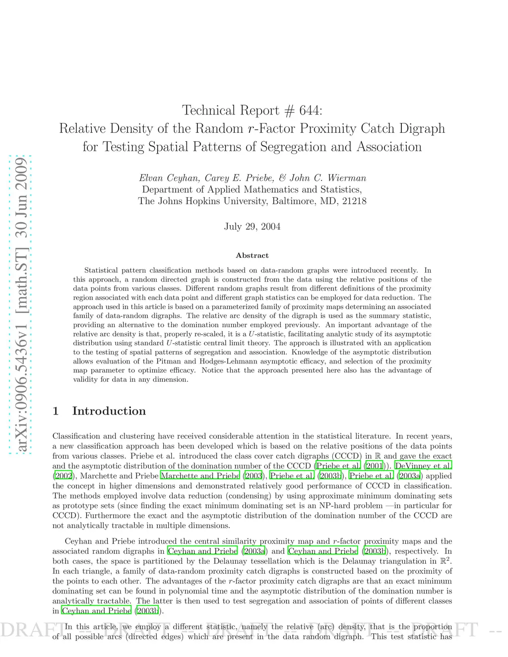 Statistical pattern classification methods based on data-random graphs were introduced recently. In this approach, a random directed graph is constructed from the data using the relative positions of the data points from various classes. Different random graphs result from different definitions of the proximity region associated with each data point and different graph statistics can be employed for data reduction. The approach used in this article is based on a parameterized family of proximity maps determining an associated family of data-random digraphs. The relative arc density of the digraph is used as the summary statistic, providing an alternative to the domination number employed previously. An important advantage of the relative arc density is that, properly re-scaled, it is a U-statistic, facilitating analytic study of its asymptotic distribution using standard U-statistic central limit theory. The approach is illustrated with an application to the testing of spatial patterns of segregation and association. Knowledge of the asymptotic distribution allows evaluation of the Pitman and Hodges-Lehmann asymptotic efficacy, and selection of the proximity map parameter to optimize efficacy. Notice that the approach presented here also has the advantage of validity for data in any dimension.