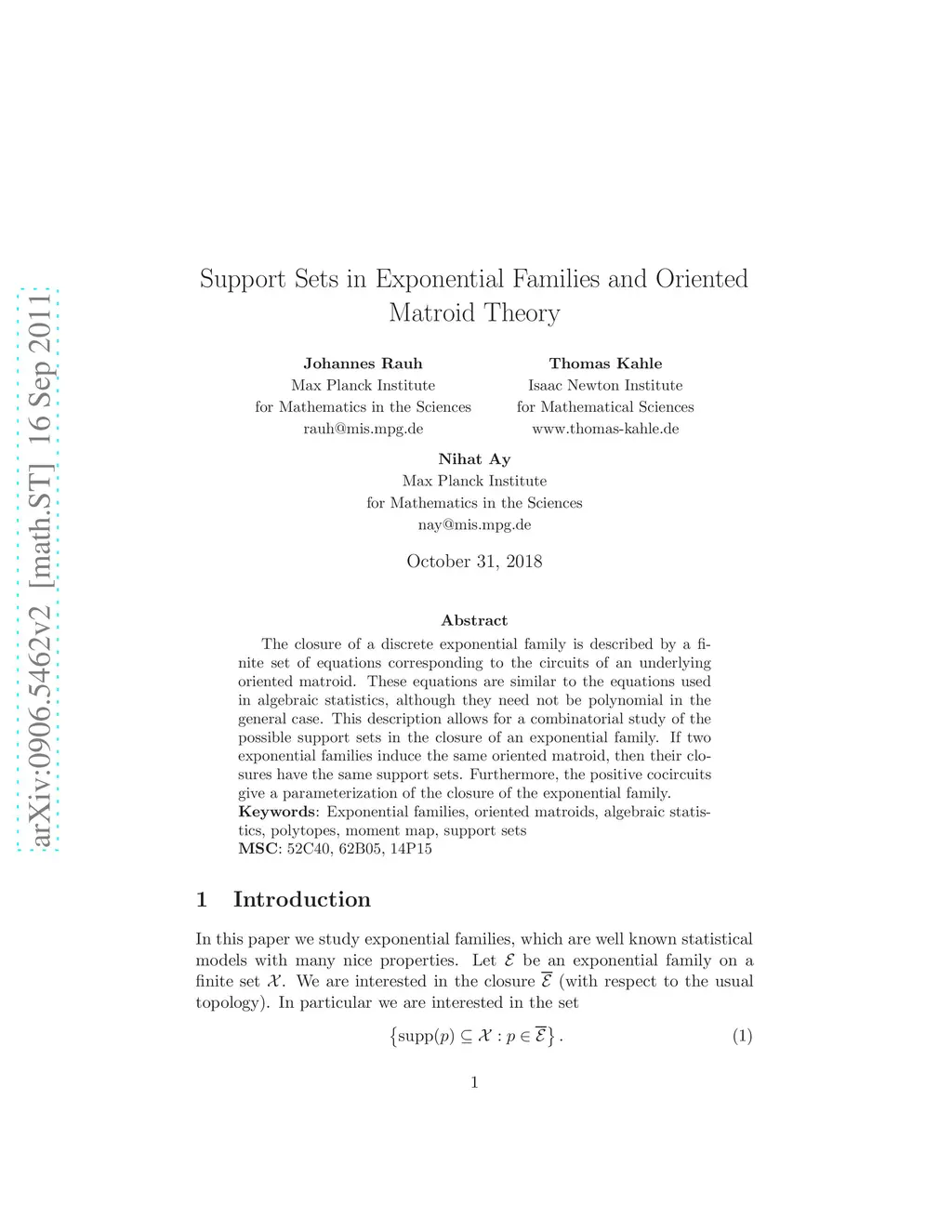 The closure of a discrete exponential family is described by a finite set of equations corresponding to the circuits of an underlying oriented matroid. These equations are similar to the equations used in algebraic statistics, although they need not be polynomial in the general case. This description allows for a combinatorial study of the possible support sets in the closure of an exponential family. If two exponential families induce the same oriented matroid, then their closures have the same support sets. Furthermore, the positive cocircuits give a parameterization of the closure of the exponential family.