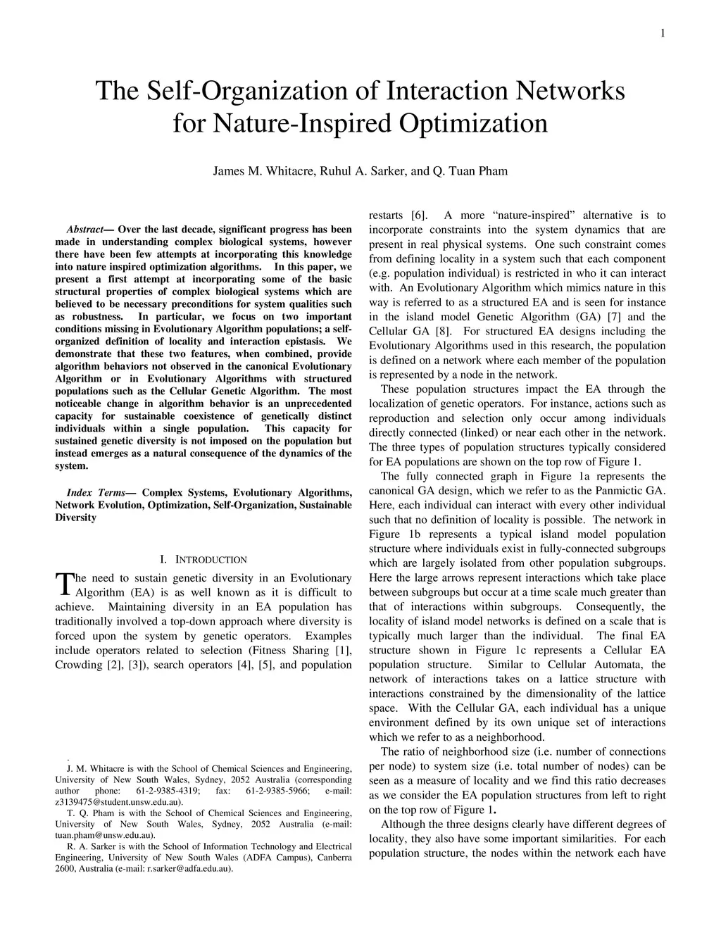 Over the last decade, significant progress has been made in understanding complex biological systems, however there have been few attempts at incorporating this knowledge into nature inspired optimization algorithms. In this paper, we present a first attempt at incorporating some of the basic structural properties of complex biological systems which are believed to be necessary preconditions for system qualities such as robustness. In particular, we focus on two important conditions missing in Evolutionary Algorithm populations; a self-organized definition of locality and interaction epistasis. We demonstrate that these two features, when combined, provide algorithm behaviors not observed in the canonical Evolutionary Algorithm or in Evolutionary Algorithms with structured populations such as the Cellular Genetic Algorithm. The most noticeable change in algorithm behavior is an unprecedented capacity for sustainable coexistence of genetically distinct individuals within a single population. This capacity for sustained genetic diversity is not imposed on the population but instead emerges as a natural consequence of the dynamics of the system.