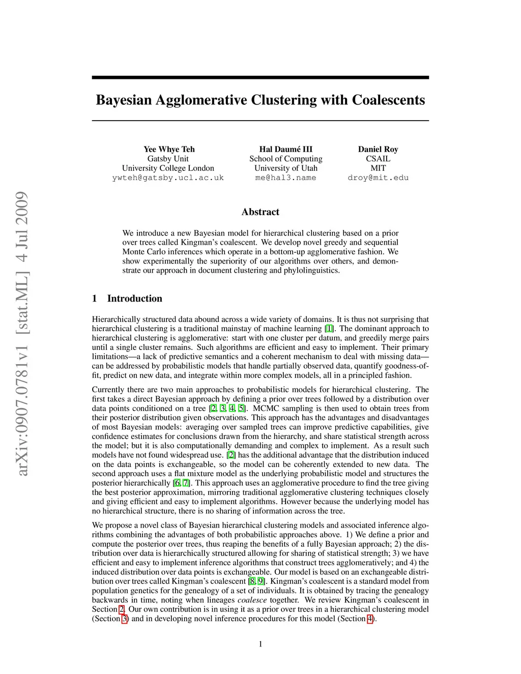 We introduce a new Bayesian model for hierarchical clustering based on a prior over trees called Kingman's coalescent. We develop novel greedy and sequential Monte Carlo inferences which operate in a bottom-up agglomerative fashion. We show experimentally the superiority of our algorithms over others, and demonstrate our approach in document clustering and phylolinguistics.