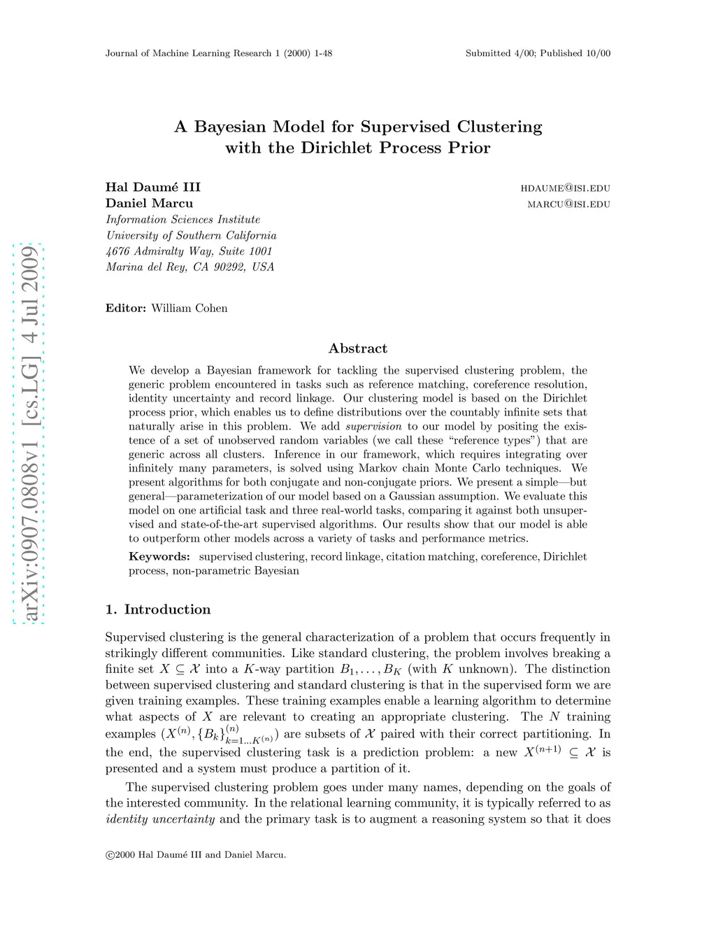We develop a Bayesian framework for tackling the supervised clustering problem, the generic problem encountered in tasks such as reference matching, coreference resolution, identity uncertainty and record linkage. Our clustering model is based on the Dirichlet process prior, which enables us to define distributions over the countably infinite sets that naturally arise in this problem. We add supervision to our model by positing the existence of a set of unobserved random variables (we call these "reference types") that are generic across all clusters. Inference in our framework, which requires integrating over infinitely many parameters, is solved using Markov chain Monte Carlo techniques. We present algorithms for both conjugate and non-conjugate priors. We present a simple--but general--parameterization of our model based on a Gaussian assumption. We evaluate this model on one artificial task and three real-world tasks, comparing it against both unsupervised and state-of-the-art supervised algorithms. Our results show that our model is able to outperform other models across a variety of tasks and performance metrics.