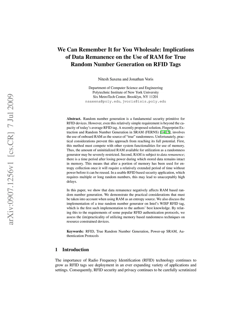 the Use of RAM for True Random Number Generation on RFID Tags (RFIDSec 2009)