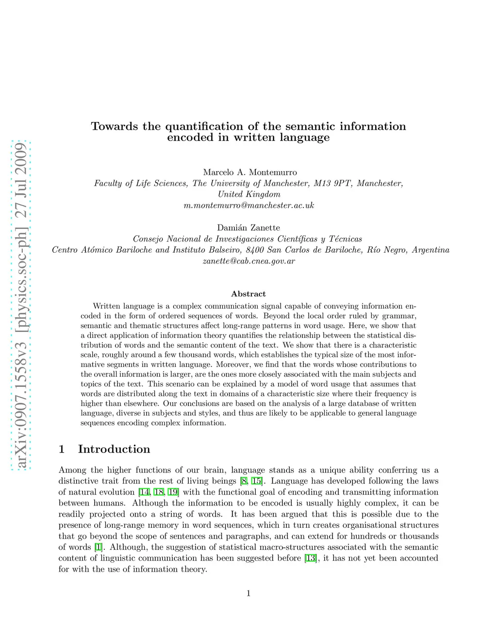 Written language is a complex communication signal capable of conveying information encoded in the form of ordered sequences of words. Beyond the local order ruled by grammar, semantic and thematic structures affect long-range patterns in word usage. Here, we show that a direct application of information theory quantifies the relationship between the statistical distribution of words and the semantic content of the text. We show that there is a characteristic scale, roughly around a few thousand words, which establishes the typical size of the most informative segments in written language. Moreover, we find that the words whose contributions to the overall information is larger, are the ones more closely associated with the main subjects and topics of the text. This scenario can be explained by a model of word usage that assumes that words are distributed along the text in domains of a characteristic size where their frequency is higher than elsewhere. Our conclusions are based on the analysis of a large database of written language, diverse in subjects and styles, and thus are likely to be applicable to general language sequences encoding complex information.