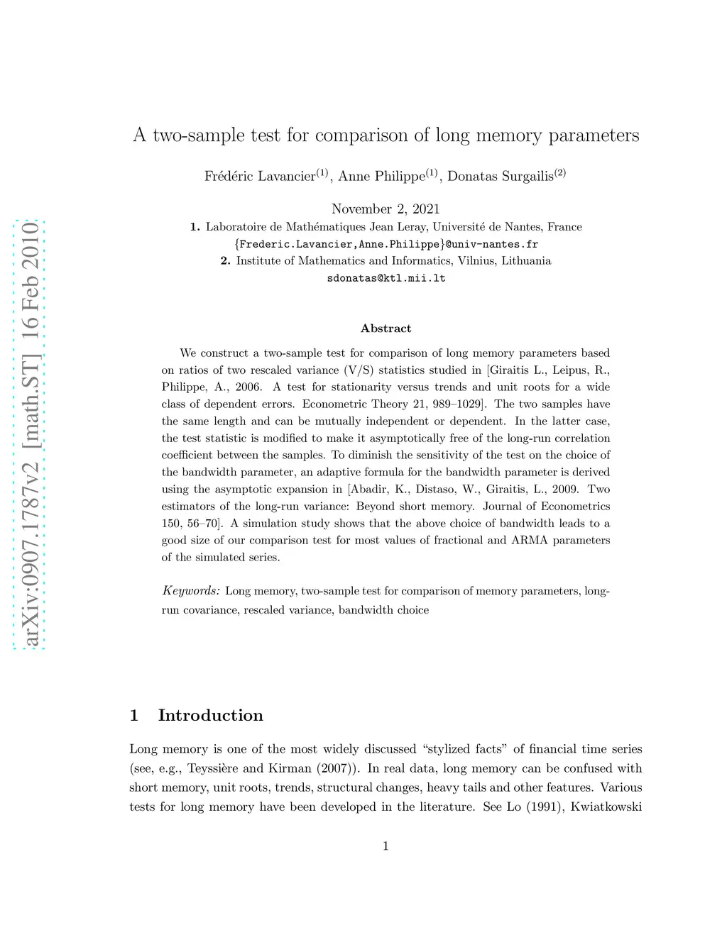 A two-sample test for comparison of long memory parameters