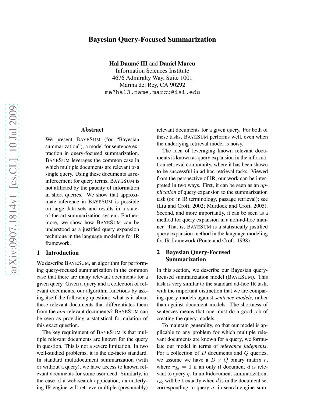 We present BayeSum (for ``Bayesian summarization''), a model for sentence extraction in query-focused summarization. BayeSum leverages the common case in which multiple documents are relevant to a single query. Using these documents as reinforcement for query terms, BayeSum is not afflicted by the paucity of information in short queries. We show that approximate inference in BayeSum is possible on large data sets and results in a state-of-the-art summarization system. Furthermore, we show how BayeSum can be understood as a justified query expansion technique in the language modeling for IR framework.