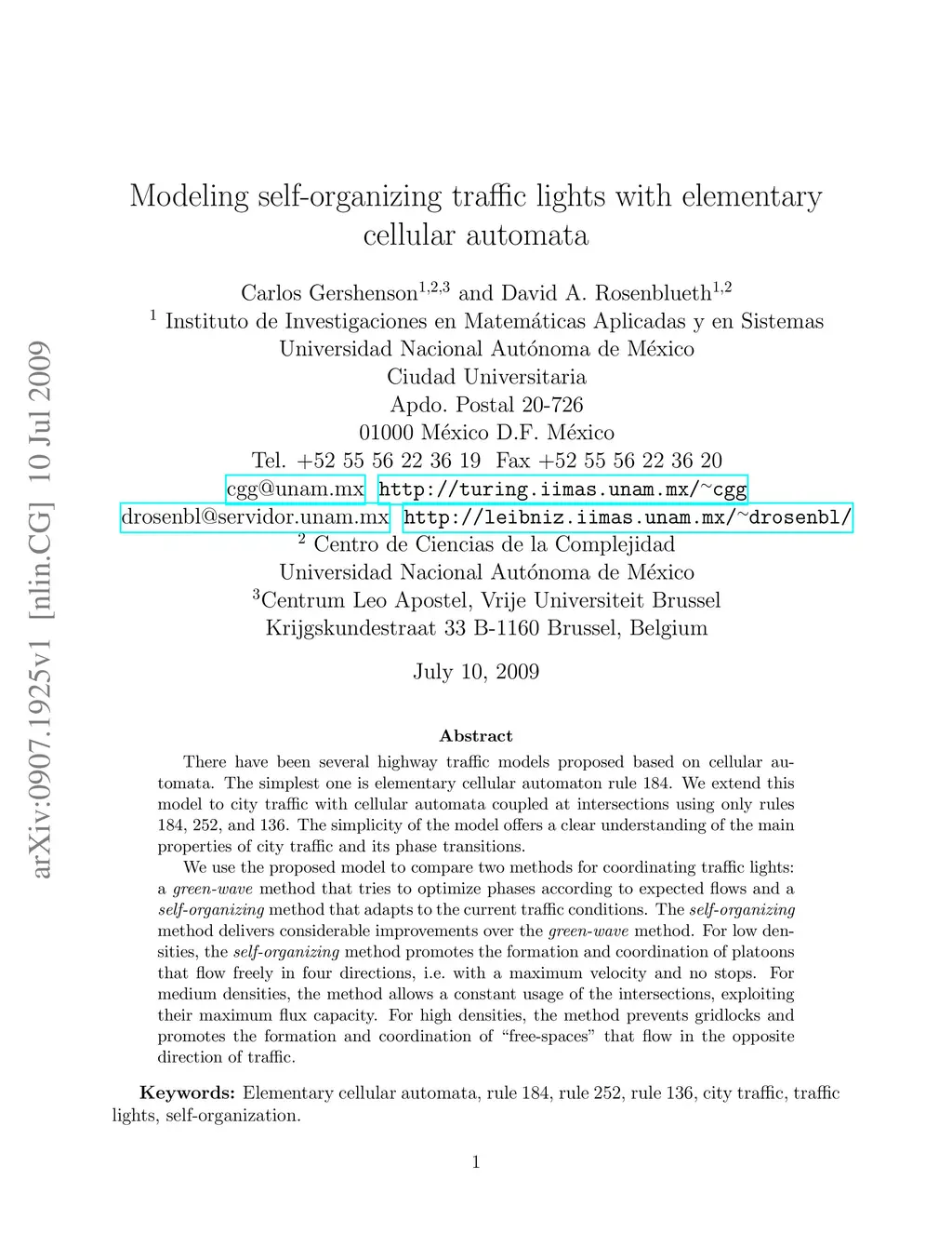 Modeling self-organizing traffic lights with elementary cellular
