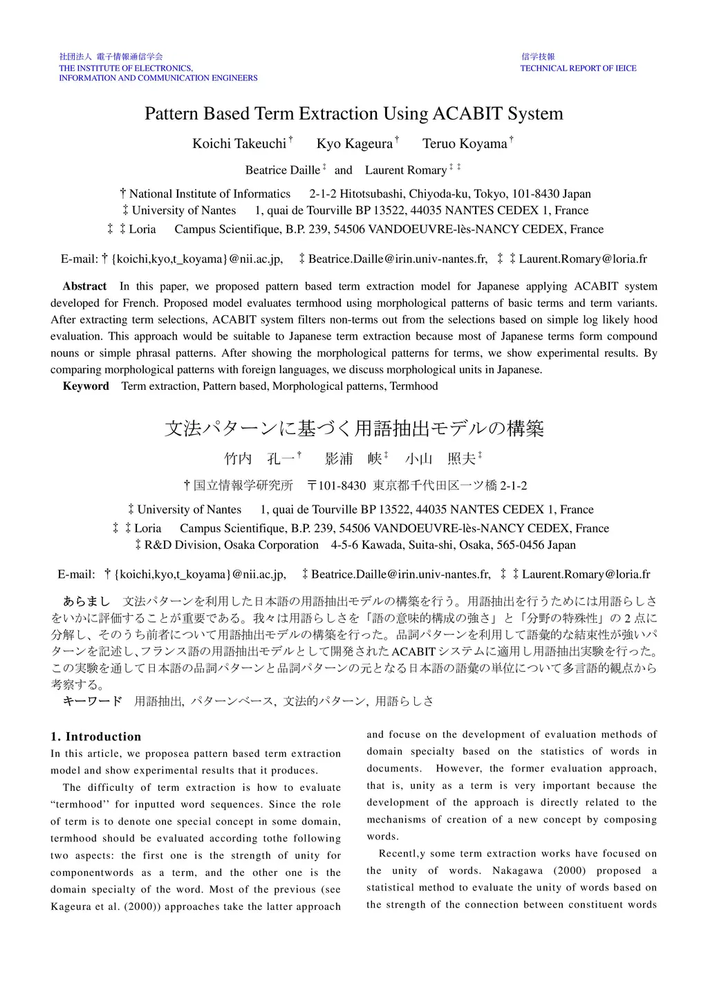 In this paper, we propose a pattern-based term extraction approach for Japanese, applying ACABIT system originally developed for French. The proposed approach evaluates termhood using morphological patterns of basic terms and term variants. After extracting term candidates, ACABIT system filters out non-terms from the candidates based on log-likelihood. This approach is suitable for Japanese term extraction because most of Japanese terms are compound nouns or simple phrasal patterns.