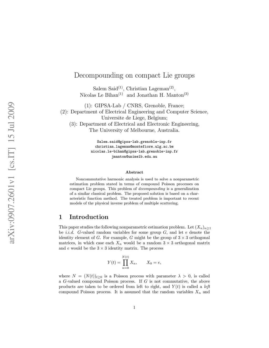 Noncommutative harmonic analysis is used to solve a nonparametric estimation problem stated in terms of compound Poisson processes on compact Lie groups. This problem of decompounding is a generalization of a similar classical problem. The proposed solution is based on a char- acteristic function method. The treated problem is important to recent models of the physical inverse problem of multiple scattering.