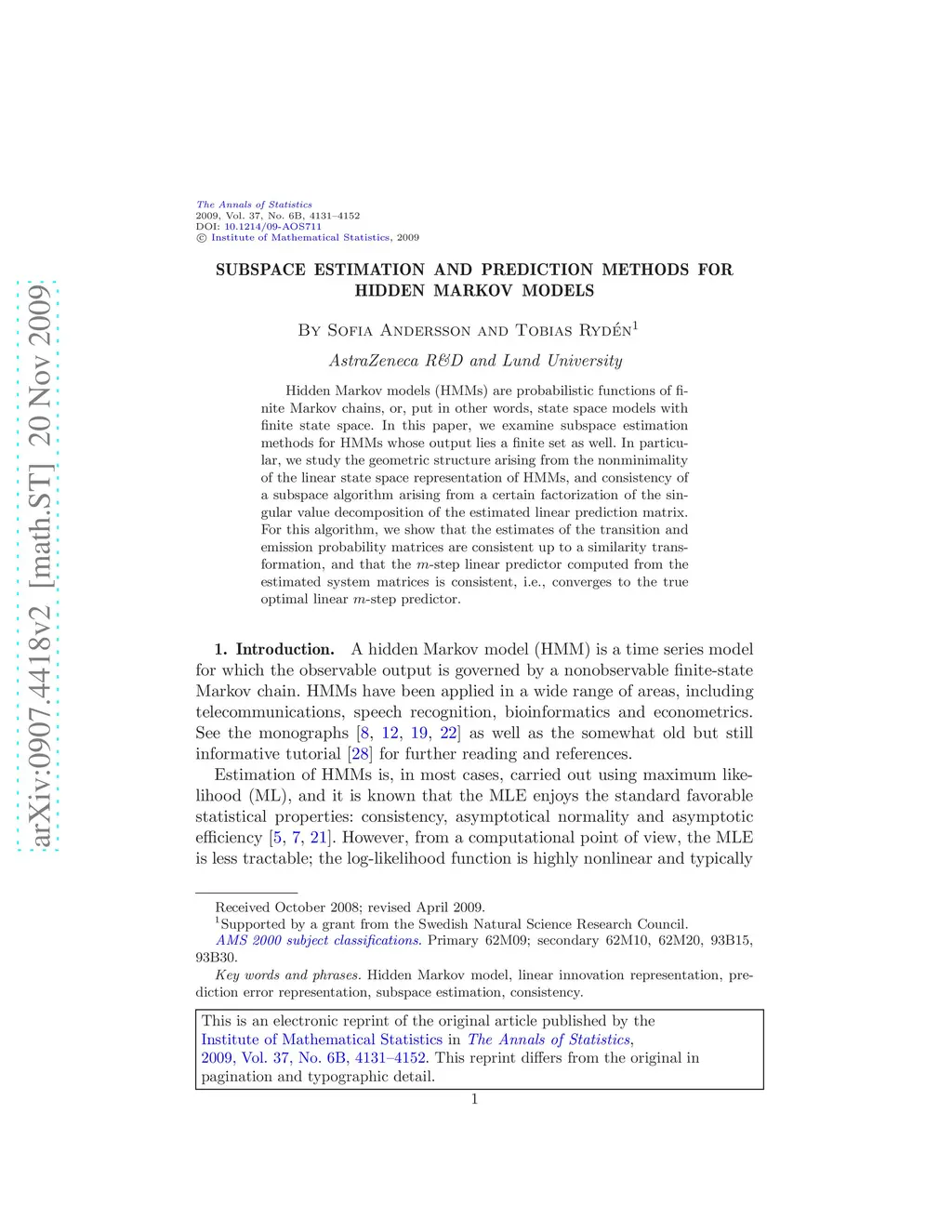 Hidden Markov models (HMMs) are probabilistic functions of finite Markov chains, or, put in other words, state space models with finite state space. In this paper, we examine subspace estimation methods for HMMs whose output lies a finite set as well. In particular, we study the geometric structure arising from the nonminimality of the linear state space representation of HMMs, and consistency of a subspace algorithm arising from a certain factorization of the singular value decomposition of the estimated linear prediction matrix. For this algorithm, we show that the estimates of the transition and emission probability matrices are consistent up to a similarity transformation, and that the -step linear predictor computed from the estimated system matrices is consistent, i.e., converges to the true optimal linear -step predictor.