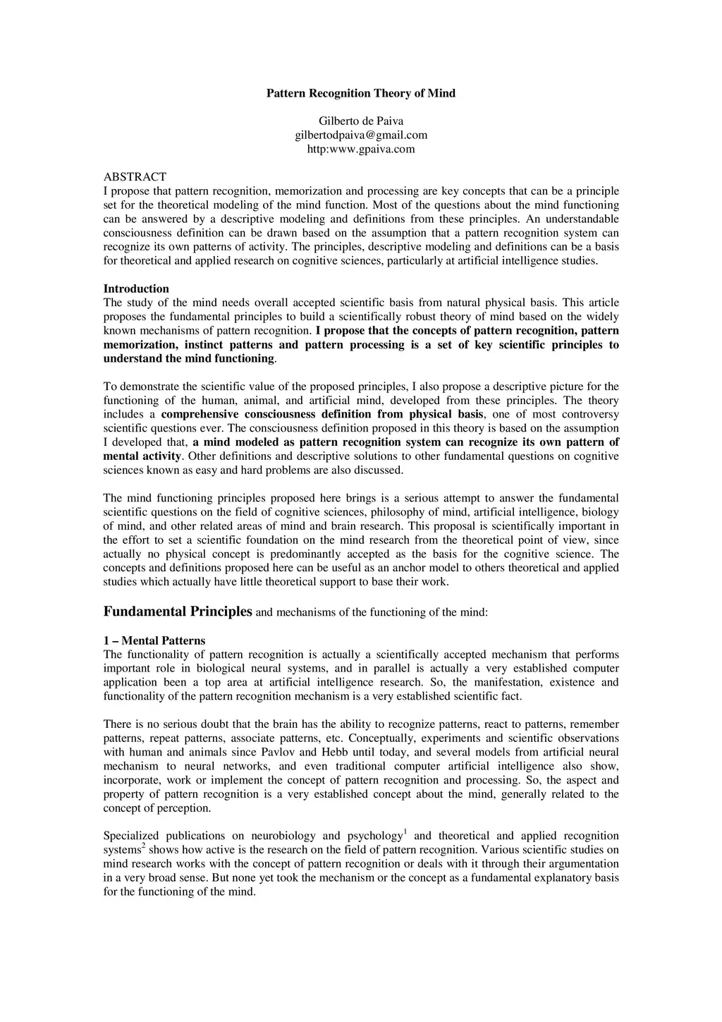 I propose that pattern recognition, memorization and processing are key concepts that can be a principle set for the theoretical modeling of the mind function. Most of the questions about the mind functioning can be answered by a descriptive modeling and definitions from these principles. An understandable consciousness definition can be drawn based on the assumption that a pattern recognition system can recognize its own patterns of activity. The principles, descriptive modeling and definitions can be a basis for theoretical and applied research on cognitive sciences, particularly at artificial intelligence studies.