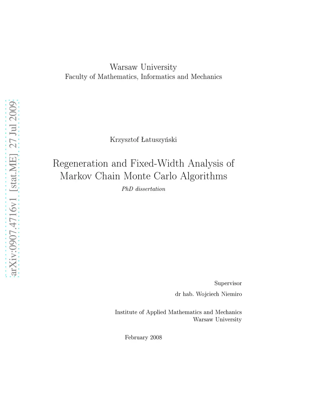 In the thesis we take the split chain approach to analyzing Markov chains and use it to establish fixed-width results for estimators obtained via Markov chain Monte Carlo procedures (MCMC). Theoretical results include necessary and sufficient conditions in terms of regeneration for central limit theorems for ergodic Markov chains and a regenerative proof of a CLT version for uniformly ergodic Markov chains with To obtain asymptotic confidence intervals for MCMC estimators, strongly consistent estimators of the asymptotic variance are essential. We relax assumptions required to obtain such estimators. Moreover, under a drift condition, nonasymptotic fixed-width results for MCMC estimators for a general state space setting (not necessarily compact) and not necessarily bounded target function are obtained. The last chapter is devoted to the idea of adaptive Monte Carlo simulation and provides convergence results and law of large numbers for adaptive procedures under path-stability condition for transition kernels.