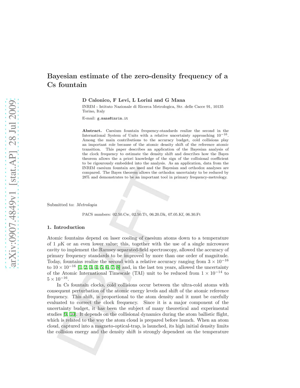 Caesium fountain frequency-standards realize the second in the International System of Units with a relative uncertainty approaching 10^-16. Among the main contributions to the accuracy budget, cold collisions play an important role because of the atomic density shift of the reference atomic transition. This paper describes an application of the Bayesian analysis of the clock frequency to estimate the density shift and describes how the Bayes theorem allows the a priori knowledge of the sign of the collisional coefficient to be rigourously embedded into the analysis. As an application, data from the INRIM caesium fountain are used and the Bayesian and orthodox analyses are compared. The Bayes theorem allows the orthodox uncertainty to be reduced by 28% and demonstrates to be an important tool in primary frequency-metrology.
