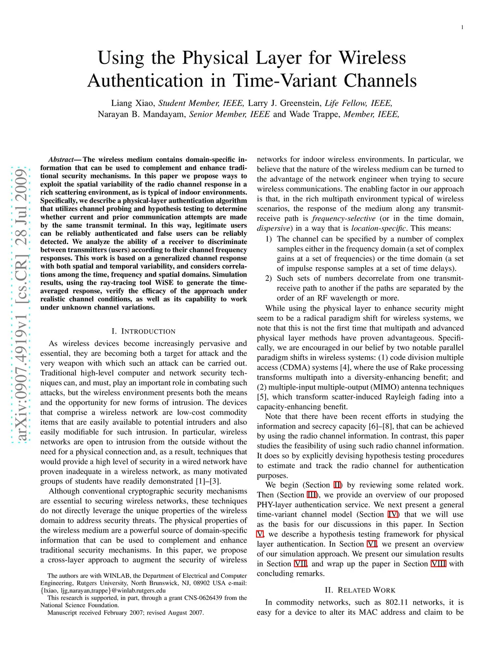 The wireless medium contains domain-specific information that can be used to complement and enhance traditional security mechanisms. In this paper we propose ways to exploit the spatial variability of the radio channel response in a rich scattering environment, as is typical of indoor environments. Specifically, we describe a physical-layer authentication algorithm that utilizes channel probing and hypothesis testing to determine whether current and prior communication attempts are made by the same transmit terminal. In this way, legitimate users can be reliably authenticated and false users can be reliably detected. We analyze the ability of a receiver to discriminate between transmitters (users) according to their channel frequency responses. This work is based on a generalized channel response with both spatial and temporal variability, and considers correlations among the time, frequency and spatial domains. Simulation results, using the ray-tracing tool WiSE to generate the time-averaged response, verify the efficacy of the approach under realistic channel conditions, as well as its capability to work under unknown channel variations.