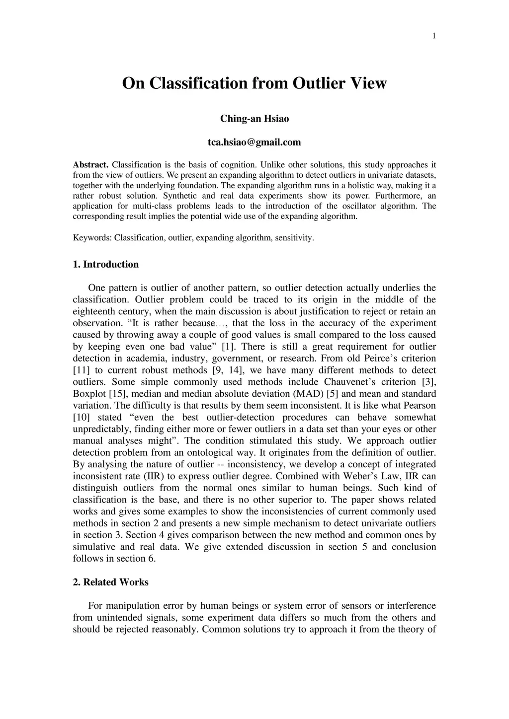 Classification is the basis of cognition. Unlike other solutions, this study approaches it from the view of outliers. We present an expanding algorithm to detect outliers in univariate datasets, together with the underlying foundation. The expanding algorithm runs in a holistic way, making it a rather robust solution. Synthetic and real data experiments show its power. Furthermore, an application for multi-class problems leads to the introduction of the oscillator algorithm. The corresponding result implies the potential wide use of the expanding algorithm.