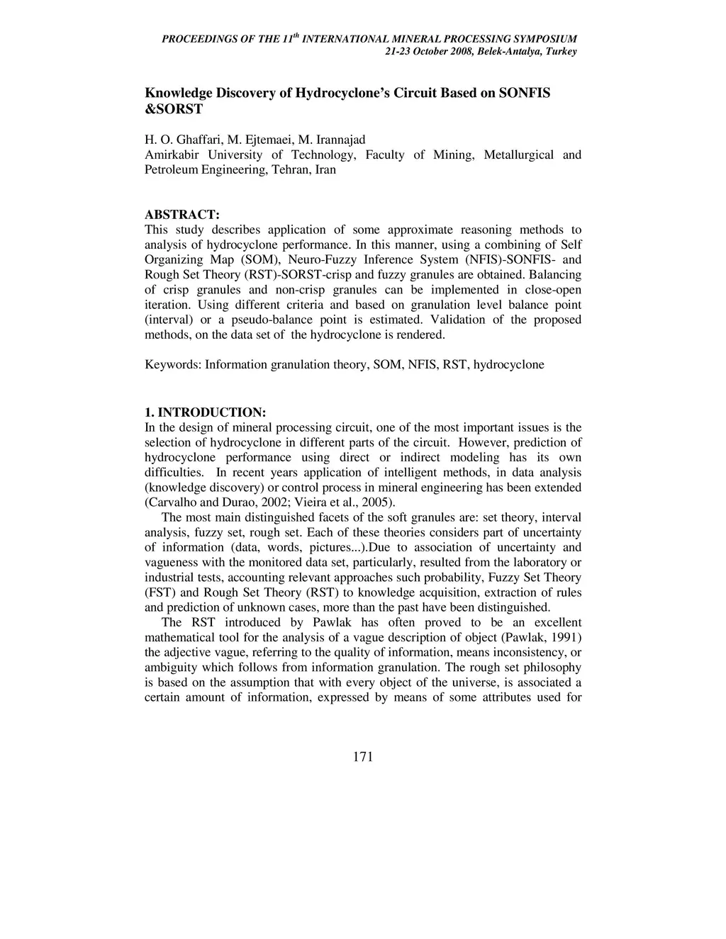This study describes application of some approximate reasoning methods to analysis of hydrocyclone performance. In this manner, using a combining of Self Organizing Map (SOM), Neuro-Fuzzy Inference System (NFIS)-SONFIS- and Rough Set Theory (RST)-SORST-crisp and fuzzy granules are obtained. Balancing of crisp granules and non-crisp granules can be implemented in close-open iteration. Using different criteria and based on granulation level balance point (interval) or a pseudo-balance point is estimated. Validation of the proposed methods, on the data set of the hydrocyclone is rendered.
