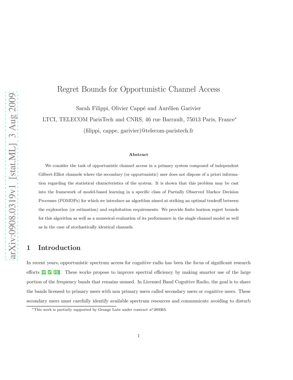 Regret Bounds for Opportunistic Channel Access