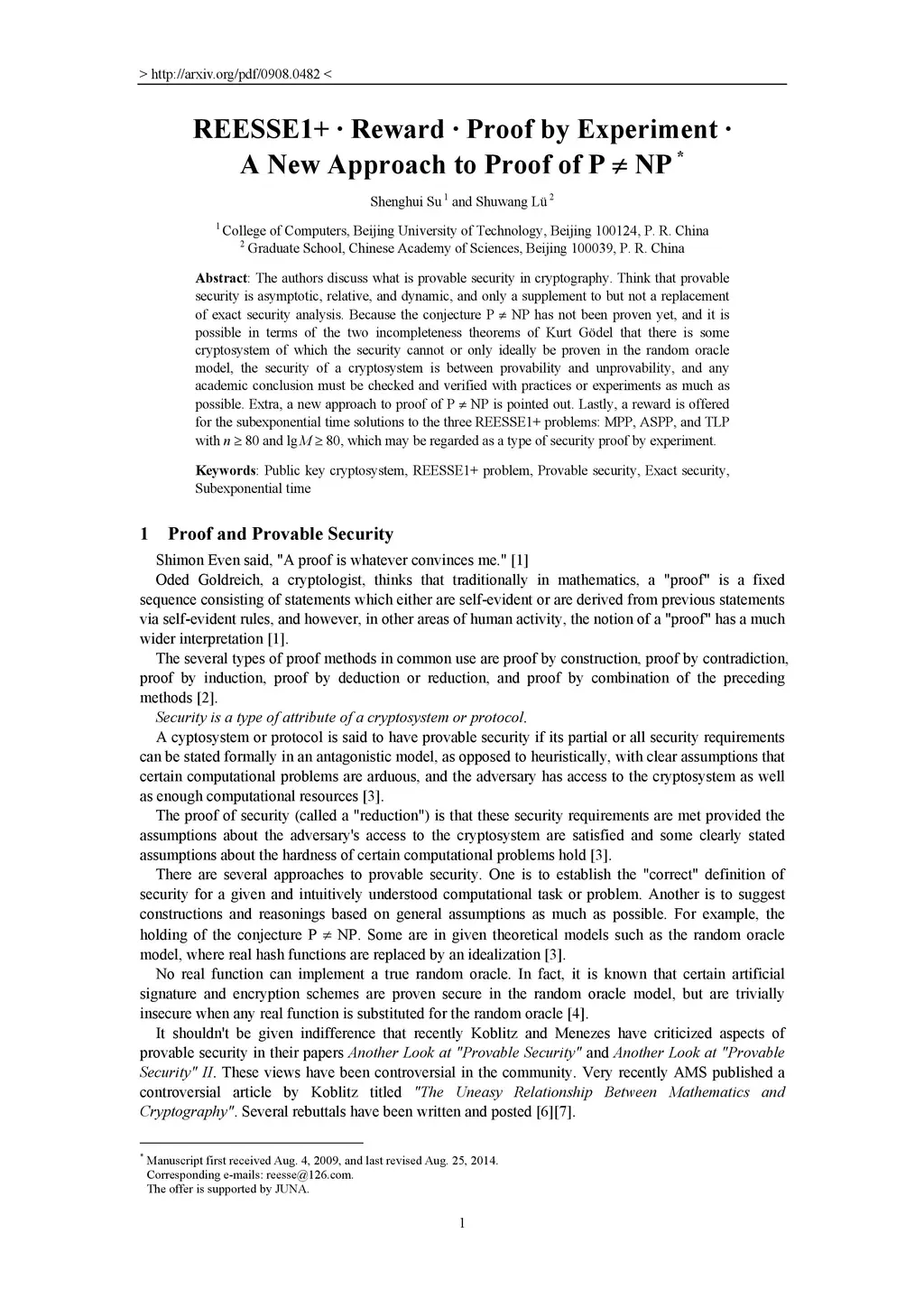 REESSE1+ . Reward . Proof by Experiment . A New Approach to Proof of P