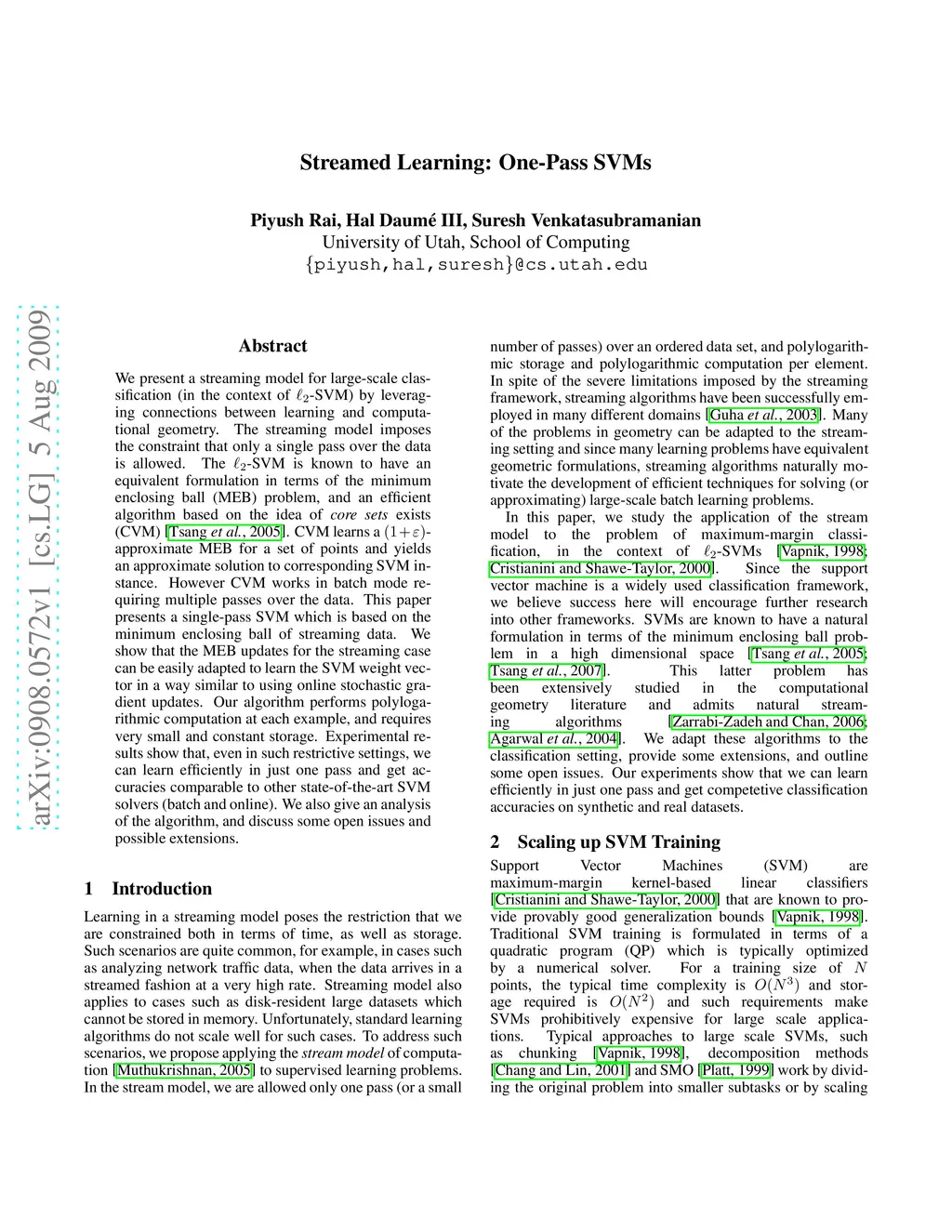 We present a streaming model for large-scale classification (in the context of -SVM) by leveraging connections between learning and computational geometry. The streaming model imposes the constraint that only a single pass over the data is allowed. The -SVM is known to have an equivalent formulation in terms of the minimum enclosing ball (MEB) problem, and an efficient algorithm based on the idea of \emph{core sets} exists (Core Vector Machine, CVM). CVM learns a -approximate MEB for a set of points and yields an approximate solution to corresponding SVM instance. However CVM works in batch mode requiring multiple passes over the data. This paper presents a single-pass SVM which is based on the minimum enclosing ball of streaming data. We show that the MEB updates for the streaming case can be easily adapted to learn the SVM weight vector in a way similar to using online stochastic gradient updates. Our algorithm performs polylogarithmic computation at each example, and requires very small and constant storage. Experimental results show that, even in such restrictive settings, we can learn efficiently in just one pass and get accuracies comparable to other state-of-the-art SVM solvers (batch and online). We also give an analysis of the algorithm, and discuss some open issues and possible extensions.