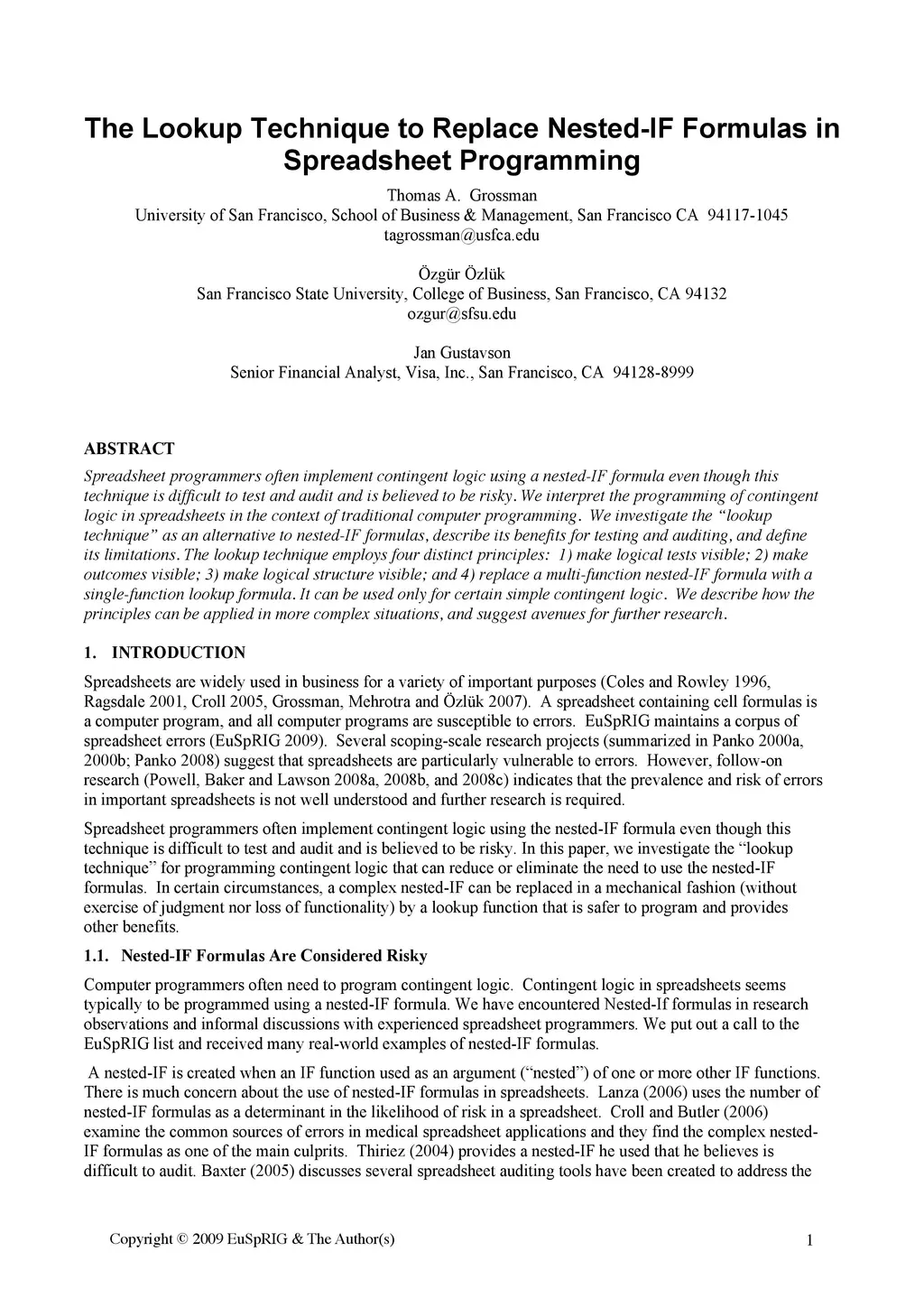 Spreadsheet programmers often implement contingent logic using a nested-IF formula even though this technique is difficult to test and audit and is believed to be risky. We interpret the programming of contingent logic in spreadsheets in the context of traditional computer programming. We investigate the "lookup technique" as an alternative to nested-IF formulas, describe its benefits for testing and auditing, and define its limitations. The lookup technique employs four distinct principles: 1) make logical tests visible; 2) make outcomes visible; 3) make logical structure visible; and 4) replace a multi-function nested-IF formula with a single-function lookup formula. It can be used only for certain simple contingent logic. We describe how the principles can be applied in more complex situations, and suggest avenues for further research.
