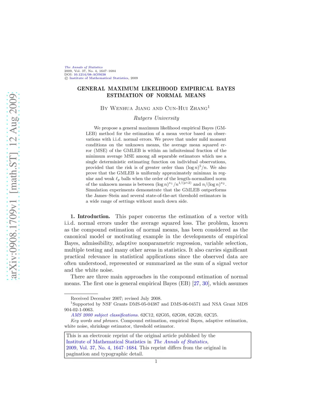 We propose a general maximum likelihood empirical Bayes (GMLEB) method for the estimation of a mean vector based on observations with i.i.d. normal errors. We prove that under mild moment conditions on the unknown means, the average mean squared error (MSE) of the GMLEB is within an infinitesimal fraction of the minimum average MSE among all separable estimators which use a single deterministic estimating function on individual observations, provided that the risk is of greater order than . We also prove that the GMLEB is uniformly approximately minimax in regular and weak balls when the order of the length-normalized norm of the unknown means is between and . Simulation experiments demonstrate that the GMLEB outperforms the James--Stein and several state-of-the-art threshold estimators in a wide range of settings without much down side.