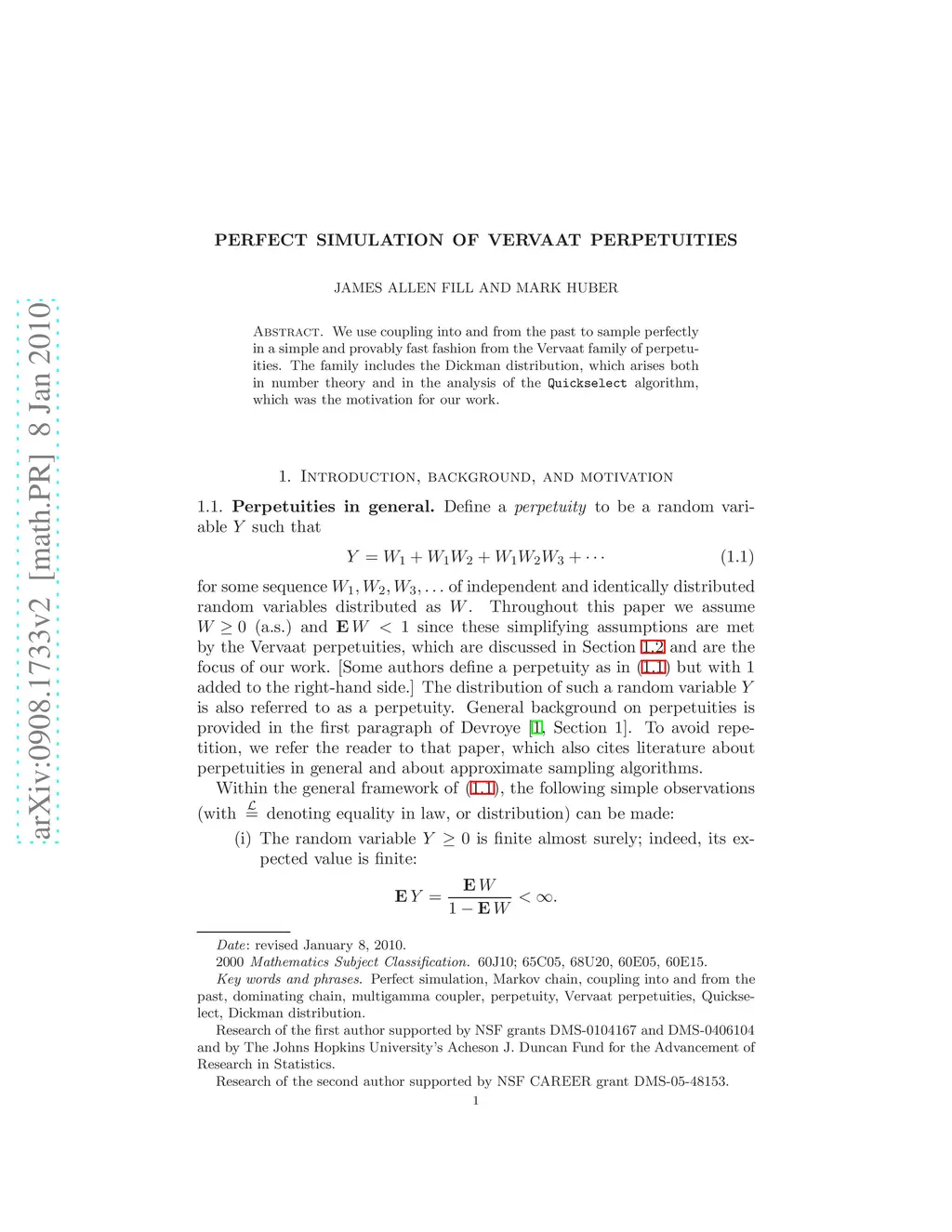 We use coupling into and from the past to sample perfectly in a simple and provably fast fashion from the Vervaat family of perpetuities. The family includes the Dickman distribution, which arises both in number theory and in the analysis of the Quickselect algorithm, which was the motivation for our work.