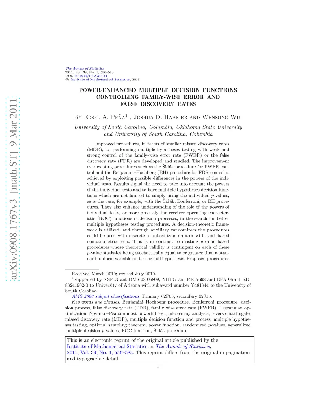 Improved procedures, in terms of smaller missed discovery rates (MDR), for performing multiple hypotheses testing with weak and strong control of the family-wise error rate (FWER) or the false discovery rate (FDR) are developed and studied. The improvement over existing procedures such as the \v{S}id\ák procedure for FWER control and the Benjamini--Hochberg (BH) procedure for FDR control is achieved by exploiting possible differences in the powers of the individual tests. Results signal the need to take into account the powers of the individual tests and to have multiple hypotheses decision functions which are not limited to simply using the individual -values, as is the case, for example, with the \v{S}id\ák, Bonferroni, or BH procedures. They also enhance understanding of the role of the powers of individual tests, or more precisely the receiver operating characteristic (ROC) functions of decision processes, in the search for better multiple hypotheses testing procedures. A decision-theoretic framework is utilized, and through auxiliary randomizers the procedures could be used with discrete or mixed-type data or with rank-based nonparametric tests. This is in contrast to existing -value based procedures whose theoretical validity is contingent on each of these -value statistics being stochastically equal to or greater than a standard uniform variable under the null hypothesis. Proposed procedures are relevant in the analysis of high-dimensional "large , small " data sets arising in the natural, physical, medical, economic and social sciences, whose generation and creation is accelerated by advances in high-throughput technology, notably, but not limited to, microarray technology.