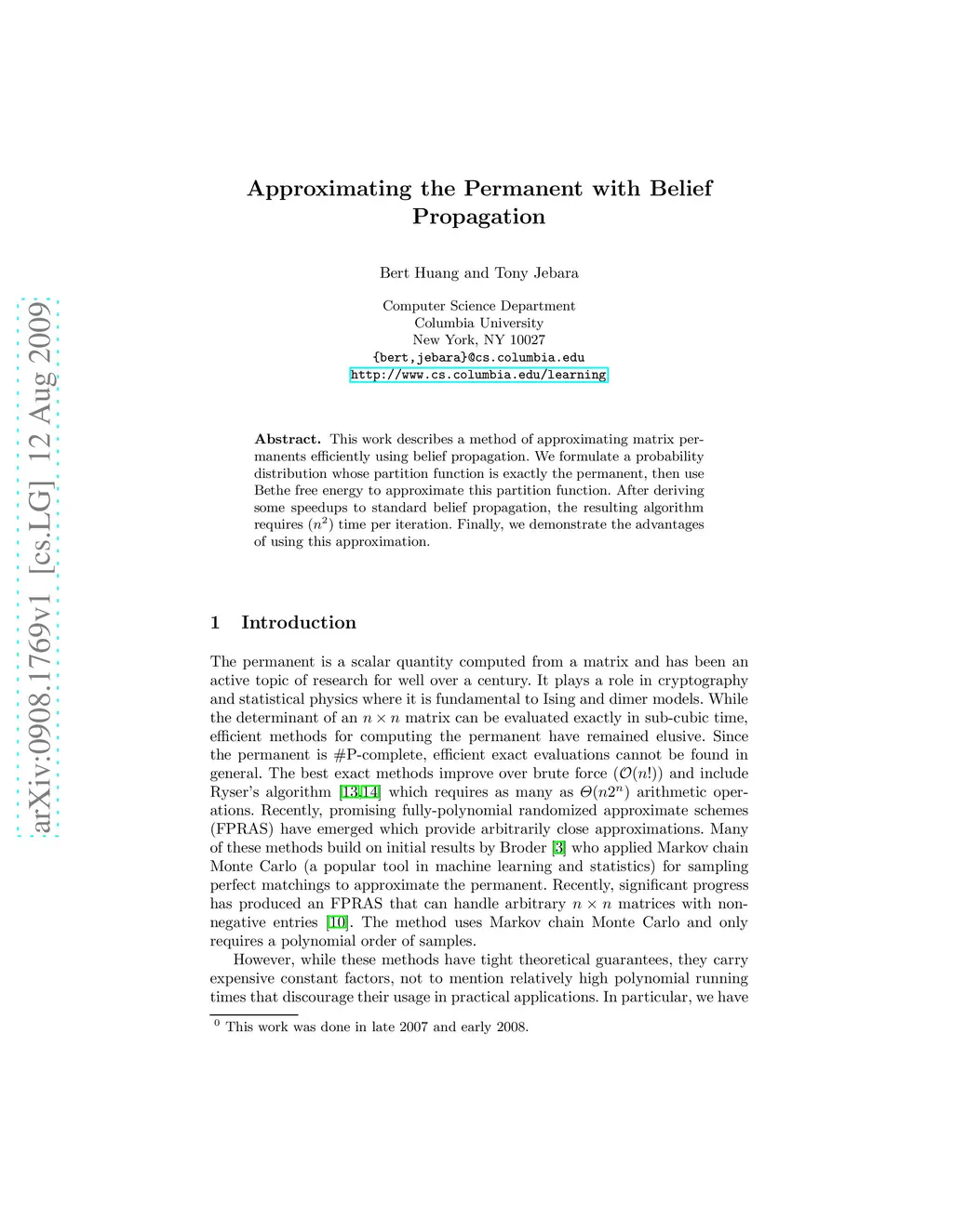 This work describes a method of approximating matrix permanents efficiently using belief propagation. We formulate a probability distribution whose partition function is exactly the permanent, then use Bethe free energy to approximate this partition function. After deriving some speedups to standard belief propagation, the resulting algorithm requires time per iteration. Finally, we demonstrate the advantages of using this approximation.