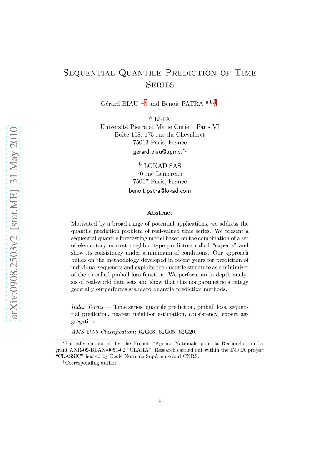 Motivated by a broad range of potential applications, we address the quantile prediction problem of real-valued time series. We present a sequential quantile forecasting model based on the combination of a set of elementary nearest neighbor-type predictors called "experts" and show its consistency under a minimum of conditions. Our approach builds on the methodology developed in recent years for prediction of individual sequences and exploits the quantile structure as a minimizer of the so-called pinball loss function. We perform an in-depth analysis of real-world data sets and show that this nonparametric strategy generally outperforms standard quantile prediction methods