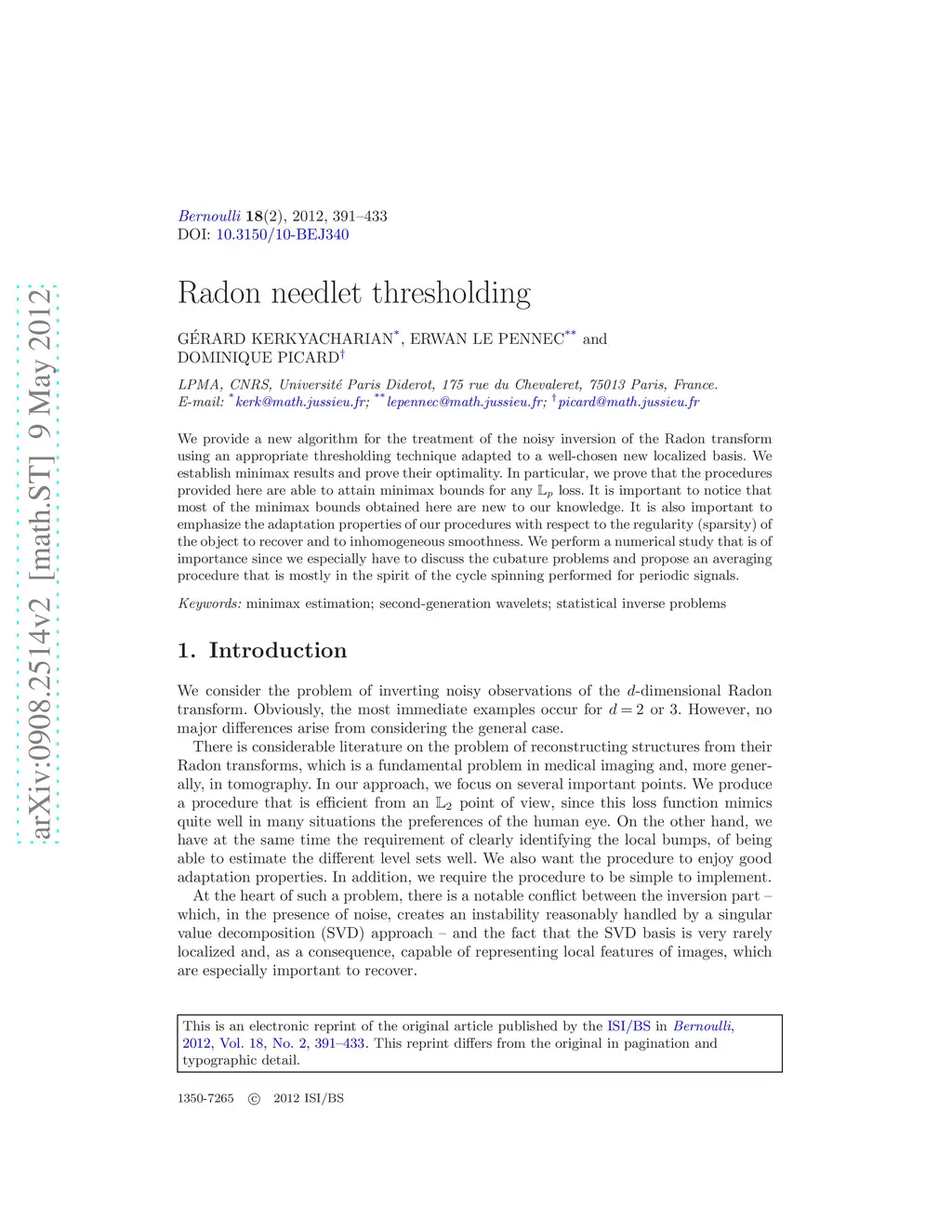 We provide a new algorithm for the treatment of the noisy inversion of the Radon transform using an appropriate thresholding technique adapted to a well-chosen new localized basis. We establish minimax results and prove their optimality. In particular, we prove that the procedures provided here are able to attain minimax bounds for any loss. It s important to notice that most of the minimax bounds obtained here are new to our knowledge. It is also important to emphasize the adaptation properties of our procedures with respect to the regularity (sparsity) of the object to recover and to inhomogeneous smoothness. We perform a numerical study that is of importance since we especially have to discuss the cubature problems and propose an averaging procedure that is mostly in the spirit of the cycle spinning performed for periodic signals.