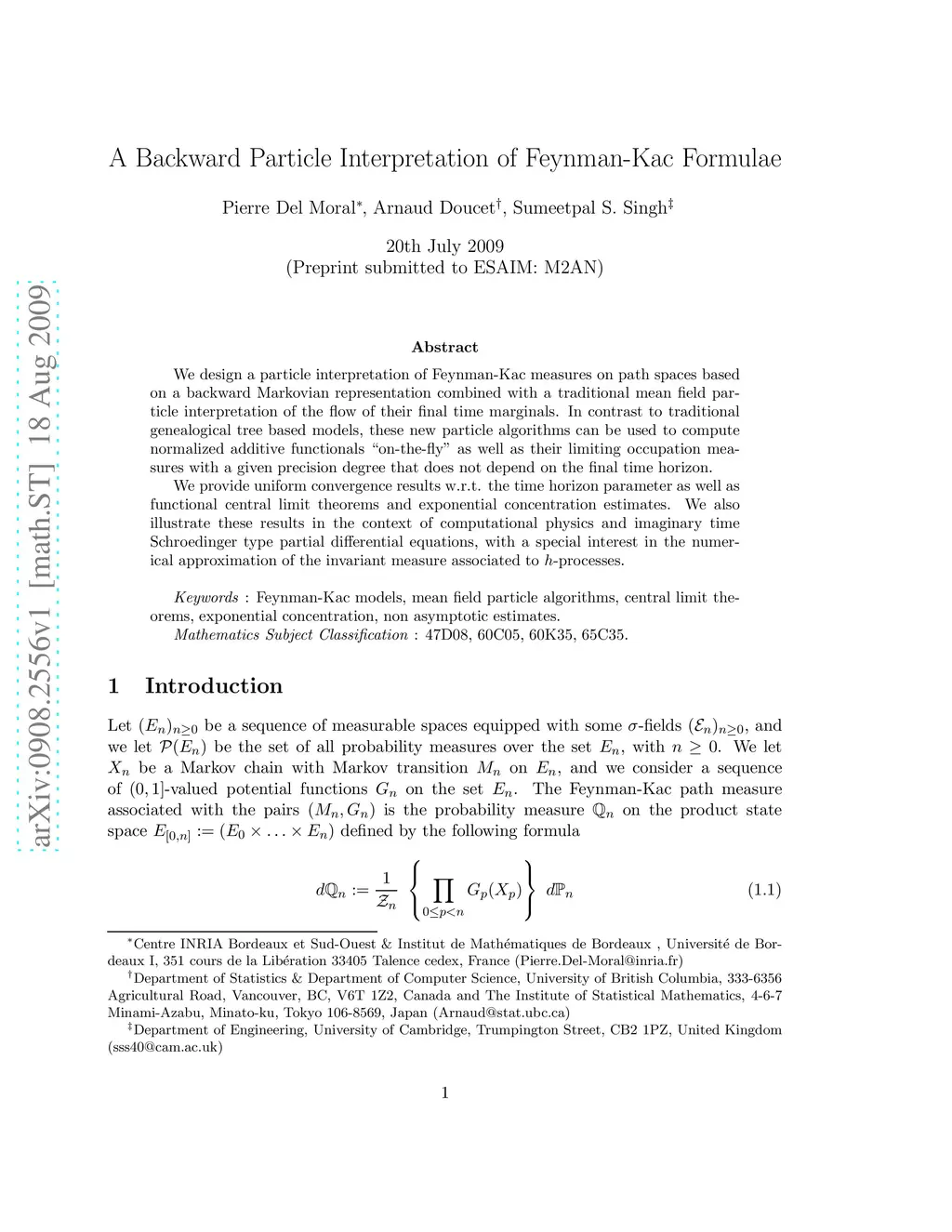 We design a particle interpretation of Feynman-Kac measures on path spaces based on a backward Markovian representation combined with a traditional mean field particle interpretation of the flow of their final time marginals. In contrast to traditional genealogical tree based models, these new particle algorithms can be used to compute normalized additive functionals "on-the-fly" as well as their limiting occupation measures with a given precision degree that does not depend on the final time horizon. We provide uniform convergence results w.r.t. the time horizon parameter as well as functional central limit theorems and exponential concentration estimates. We also illustrate these results in the context of computational physics and imaginary time Schroedinger type partial differential equations, with a special interest in the numerical approximation of the invariant measure associated to -processes.