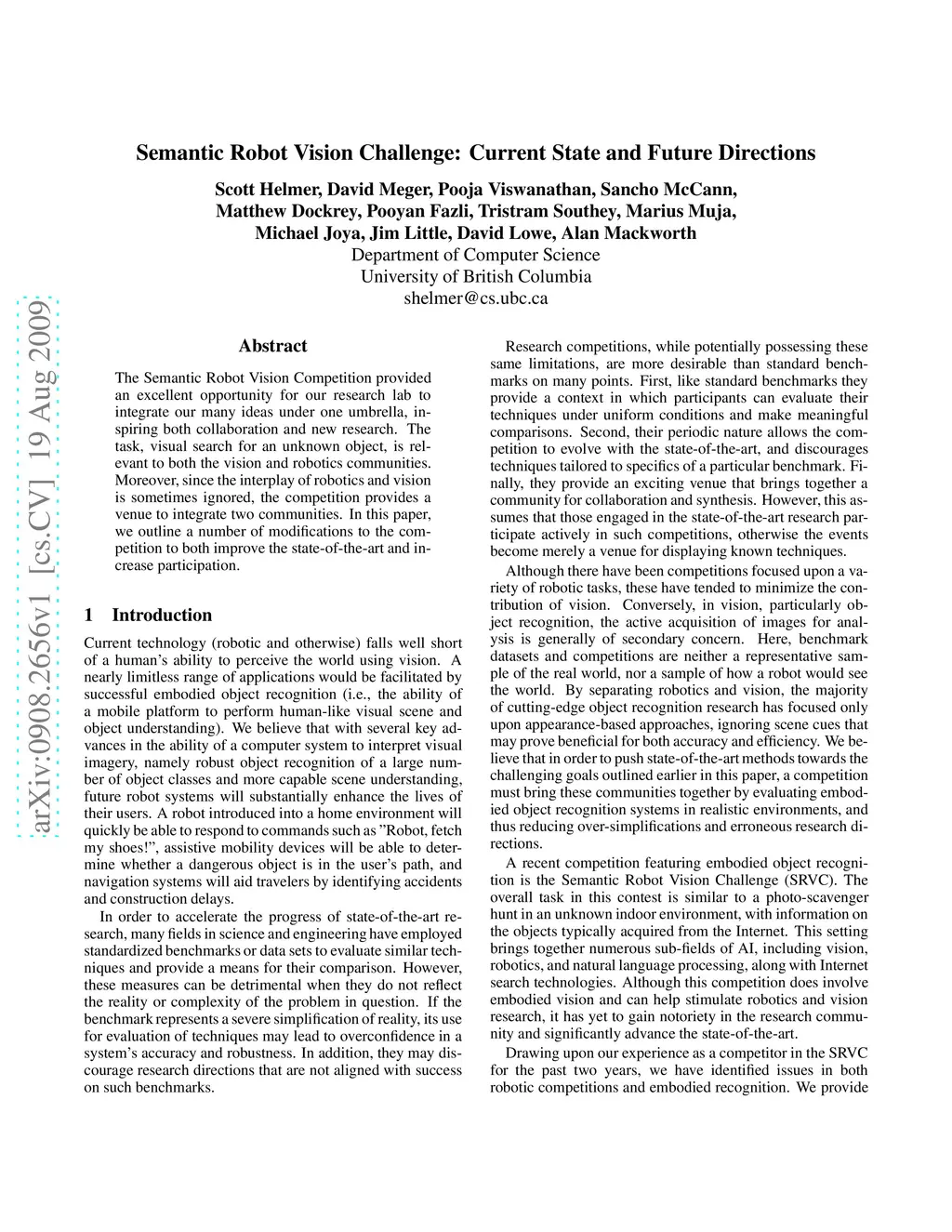 The Semantic Robot Vision Competition provided an excellent opportunity for our research lab to integrate our many ideas under one umbrella, inspiring both collaboration and new research. The task, visual search for an unknown object, is relevant to both the vision and robotics communities. Moreover, since the interplay of robotics and vision is sometimes ignored, the competition provides a venue to integrate two communities. In this paper, we outline a number of modifications to the competition to both improve the state-of-the-art and increase participation.