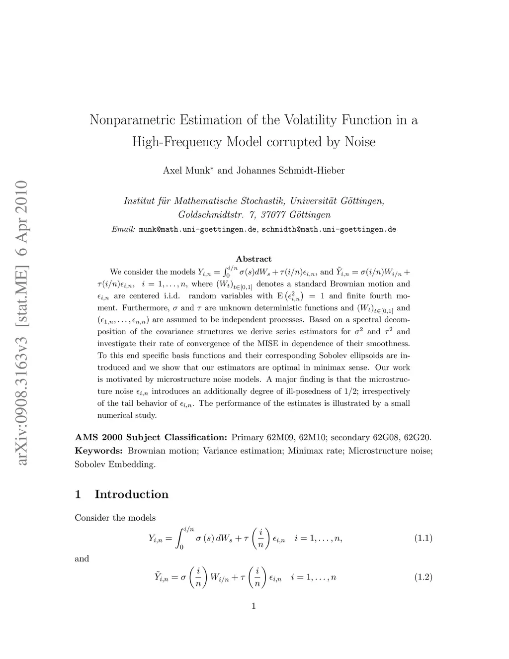 We consider the models Y_{i,n}=\int_0^{i/n} \sigma(s)dW_s+\tau(i/n)\epsilon_{i,n}, and \tilde Y_{i,n}=\sigma(i/n)W_{i/n}+\tau(i/n)\epsilon_{i,n}, i=1,...,n, where W_t denotes a standard Brownian motion and \epsilon_{i,n} are centered i.i.d. random variables with E(\epsilon_{i,n}^2)=1 and finite fourth moment. Furthermore, \sigma and \tau are unknown deterministic functions and W_t and (\epsilon_{1,n},...,\epsilon_{n,n}) are assumed to be independent processes. Based on a spectral decomposition of the covariance structures we derive series estimators for \sigma^2 and \tau^2 and investigate their rate of convergence of the MISE in dependence of their smoothness. To this end specific basis functions and their corresponding Sobolev ellipsoids are introduced and we show that our estimators are optimal in minimax sense. Our work is motivated by microstructure noise models. Our major finding is that the microstructure noise \epsilon_{i,n} introduces an additionally degree of ill-posedness of 1/2; irrespectively of the tail behavior of \epsilon_{i,n}. The method is illustrated by a small numerical study.