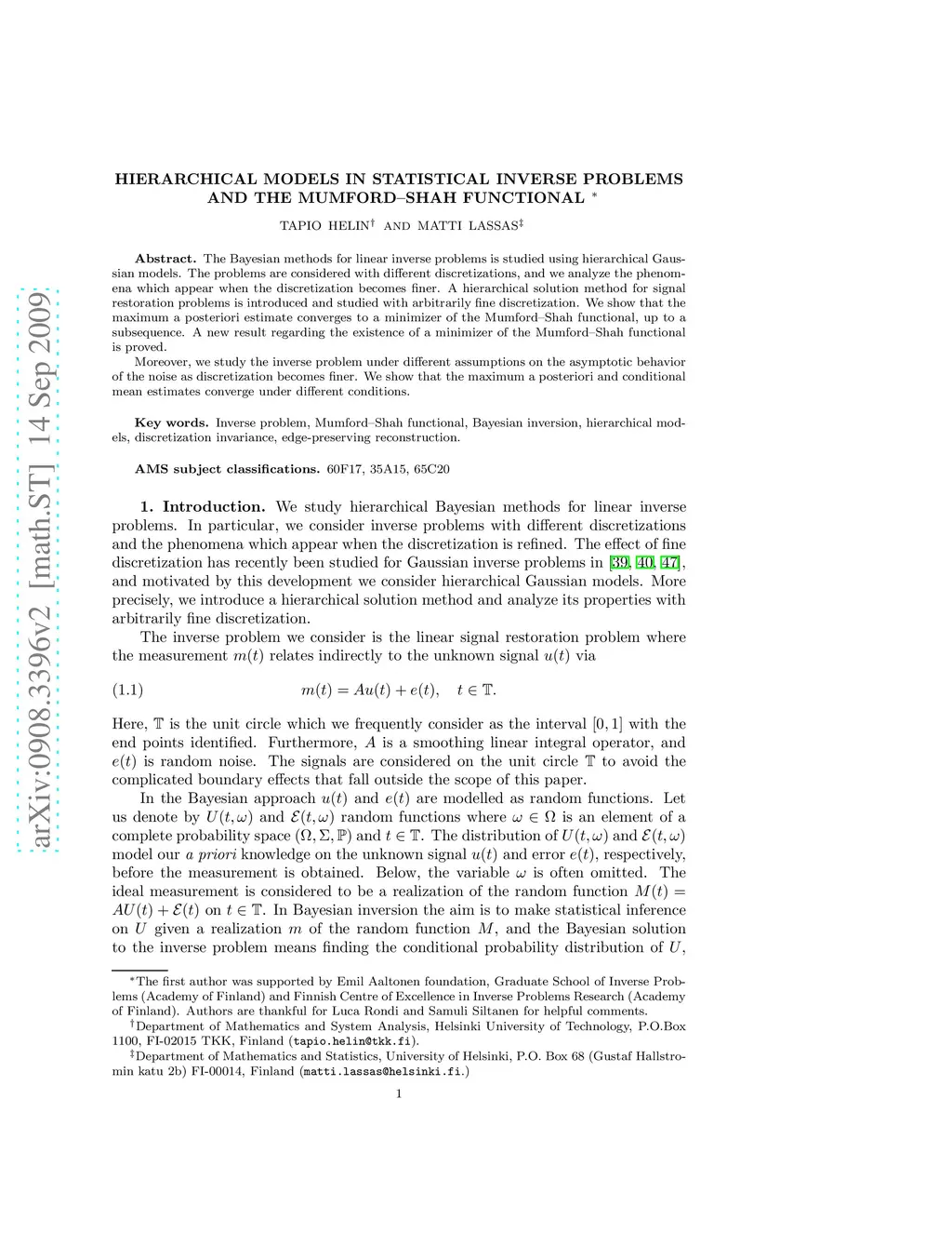 The Bayesian methods for linear inverse problems is studied using hierarchical Gaussian models. The problems are considered with different discretizations, and we analyze the phenomena which appear when the discretization becomes finer. A hierarchical solution method for signal restoration problems is introduced and studied with arbitrarily fine discretization. We show that the maximum a posteriori estimate converges to a minimizer of the Mumford--Shah functional, up to a subsequence. A new result regarding the existence of a minimizer of the Mumford--Shah functional is proved. Moreover, we study the inverse problem under different assumptions on the asymptotic behavior of the noise as discretization becomes finer. We show that the maximum a posteriori and conditional mean estimates converge under different conditions.