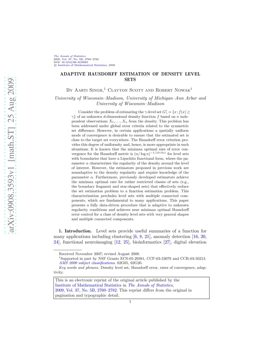 Consider the problem of estimating the -level set of an unknown -dimensional density function based on independent observations from the density. This problem has been addressed under global error criteria related to the symmetric set difference. However, in certain applications a spatially uniform mode of convergence is desirable to ensure that the estimated set is close to the target set everywhere. The Hausdorff error criterion provides this degree of uniformity and, hence, is more appropriate in such situations. It is known that the minimax optimal rate of error convergence for the Hausdorff metric is for level sets with boundaries that have a Lipschitz functional form, where the parameter characterizes the regularity of the density around the level of interest. However, the estimators proposed in previous work are nonadaptive to the density regularity and require knowledge of the parameter . Furthermore, previously developed estimators achieve the minimax optimal rate for rather restricted classes of sets (e.g., the boundary fragment and star-shaped sets) that effectively reduce the set estimation problem to a function estimation problem. This characterization precludes level sets with multiple connected components, which are fundamental to many applications. This paper presents a fully data-driven procedure that is adaptive to unknown regularity conditions and achieves near minimax optimal Hausdorff error control for a class of density level sets with very general shapes and multiple connected components.